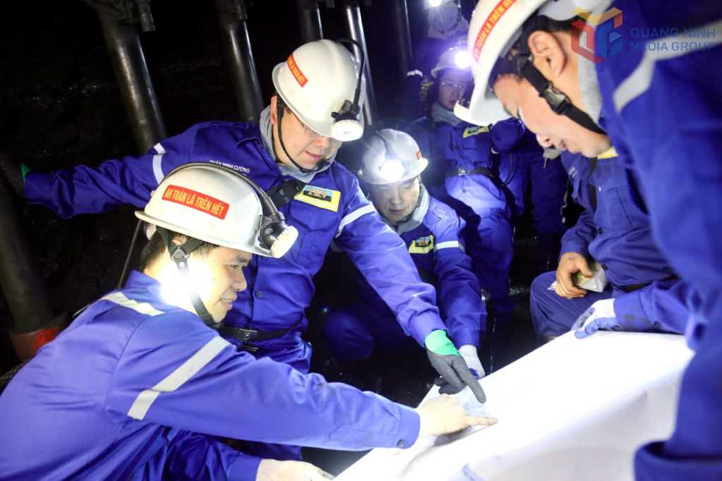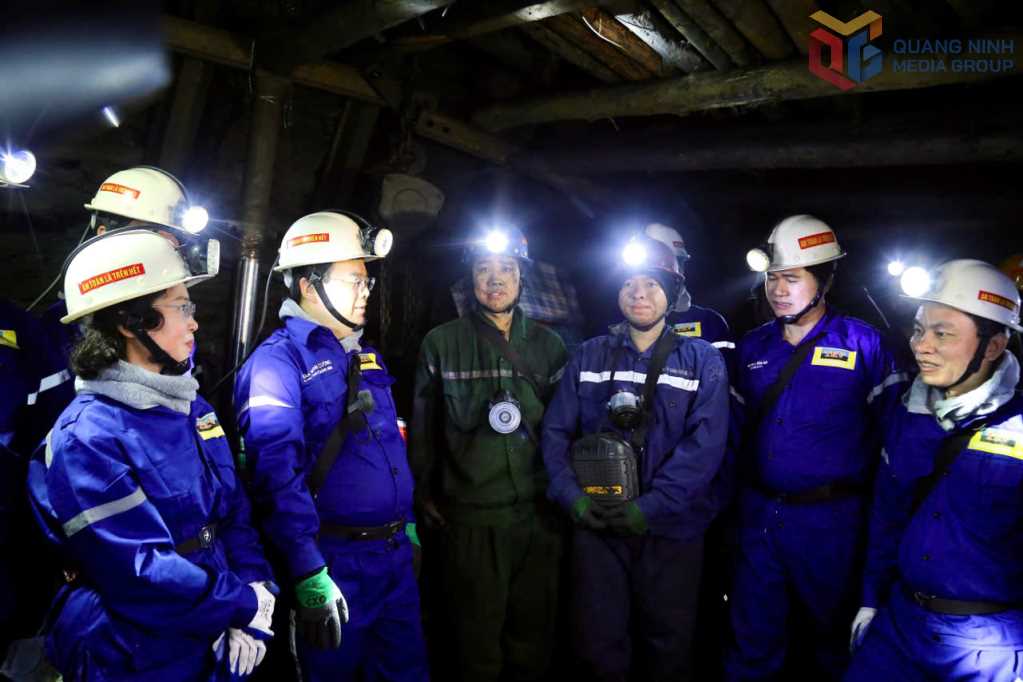 Đồng chí Bí thư Tỉnh ủy cùng các đồng chí lãnh đạo tỉnh xuống Lò chợ vỉa 5 Đông -150/-80 của Phân xưởng Khai thác 10.