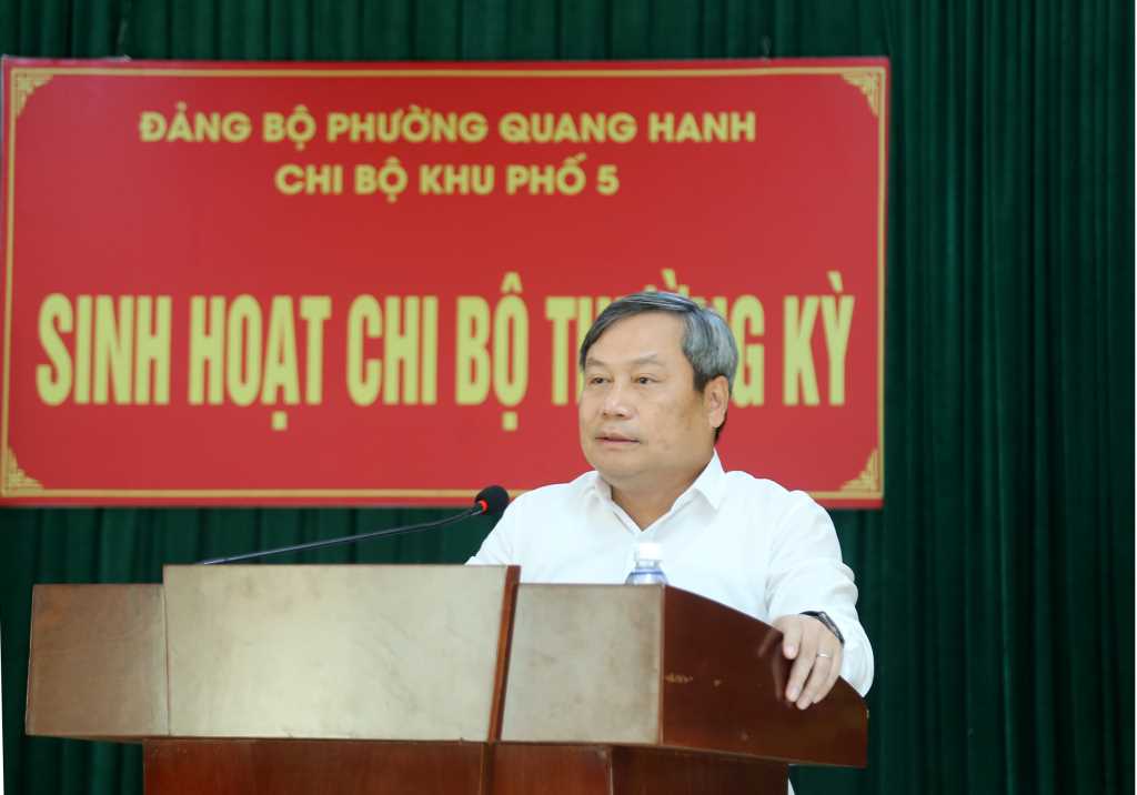 Đối với phường Quang Hanh, sau khi thực hiện mô hình chính quyền địa phương 2 cấp được tỉnh đặt kỳ vọng rất lớn, sẽ bứt phá trở thành trung tâm du lịch, dịch vụ, thương mại chất lượng cao, đô thị văn minh, đô thị đáng sống. Vì vậy, đồng chí Bí thư Tỉnh ủy đề nghị Chi bộ khu phố 5 nói riêng và các chi bộ đảng trên địa bàn phường tiếp tục tuyên truyền, vận động nhân dân đồng thuận với chính sách chung, với việc triển khai các dự án, công trình trên địa bàn để tạo thuận lợi cho phát triển KTXH trên địa bàn phường. Đồng thời, mong muốn cán bộ, đảng viên, nhân dân trên địa bàn tích cực chung tay tham gia chỉnh trang đô thị, chỉnh trang các khu dân cư, xây dựng các tuyến phố kiểu mẫu, văn minh đô thị, nâng cao chất lượng đời sống nhân dân.