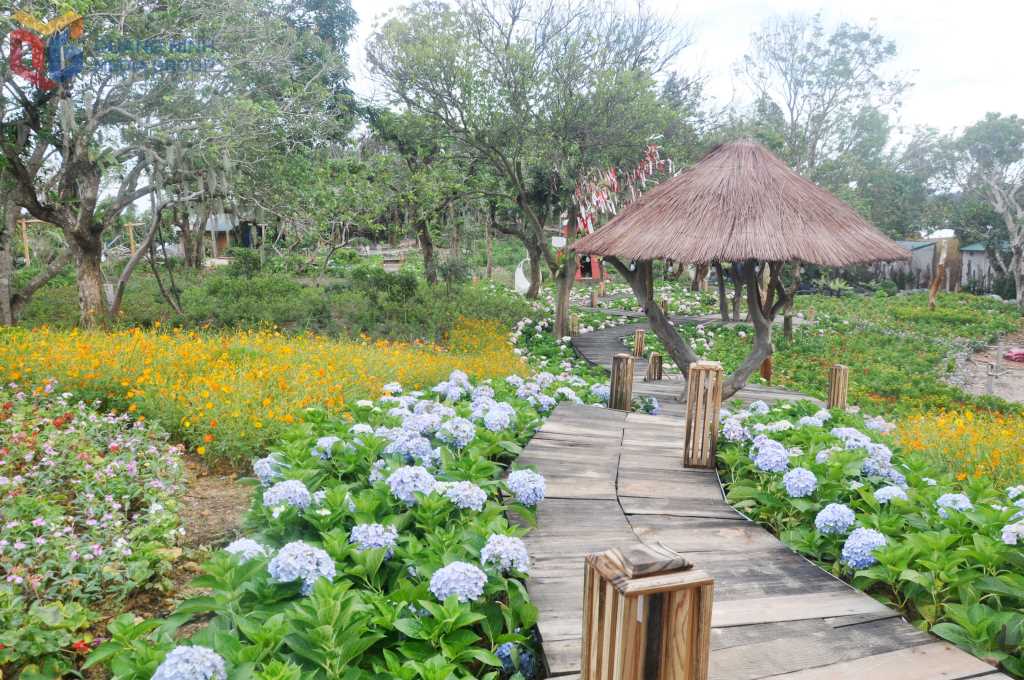 Vườn hoa được đầu tư làm điểm cà phê - check in tại khu du lịch Co To Village trên đảo Cô Tô.