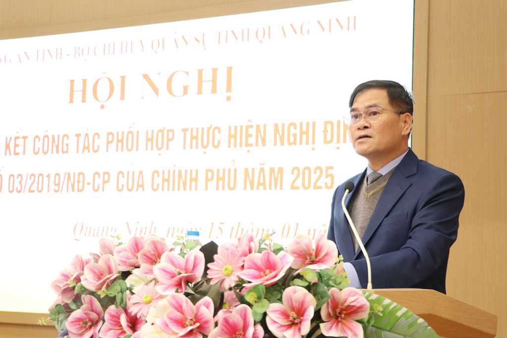 Chiều 15/1, Công an tỉnh và Bộ Chỉ huy Quân sự (CHQS) tỉnh Quảng Ninh tổ chức hội nghị tổng kết thực hiện Nghị định số 03/2019/NĐ-CP của Chính phủ năm 2025; triển khai nhiệm vụ năm 2026. Đồng chí Bùi Văn Khắng, Phó Bí thư Tỉnh ủy, Chủ tịch UBND tỉnh dự và chỉ đạo hội nghị. Thiếu tướng Nguyễn Tiến Trung, Ủy viên Ban Thường vụ Tỉnh ủy, Giám đốc Công an tỉnh; Đại tá Bùi Đức Lâm, Phó Chỉ huy trưởng, Tham mưu trưởng Bộ CHQS tỉnh đồng chủ trì hội nghị. Cùng dự có đại biểu các đơn vị Quân đội thuộc Bộ Quốc phòng, Quân khu 3 đứng chân trên địa bàn tỉnh.