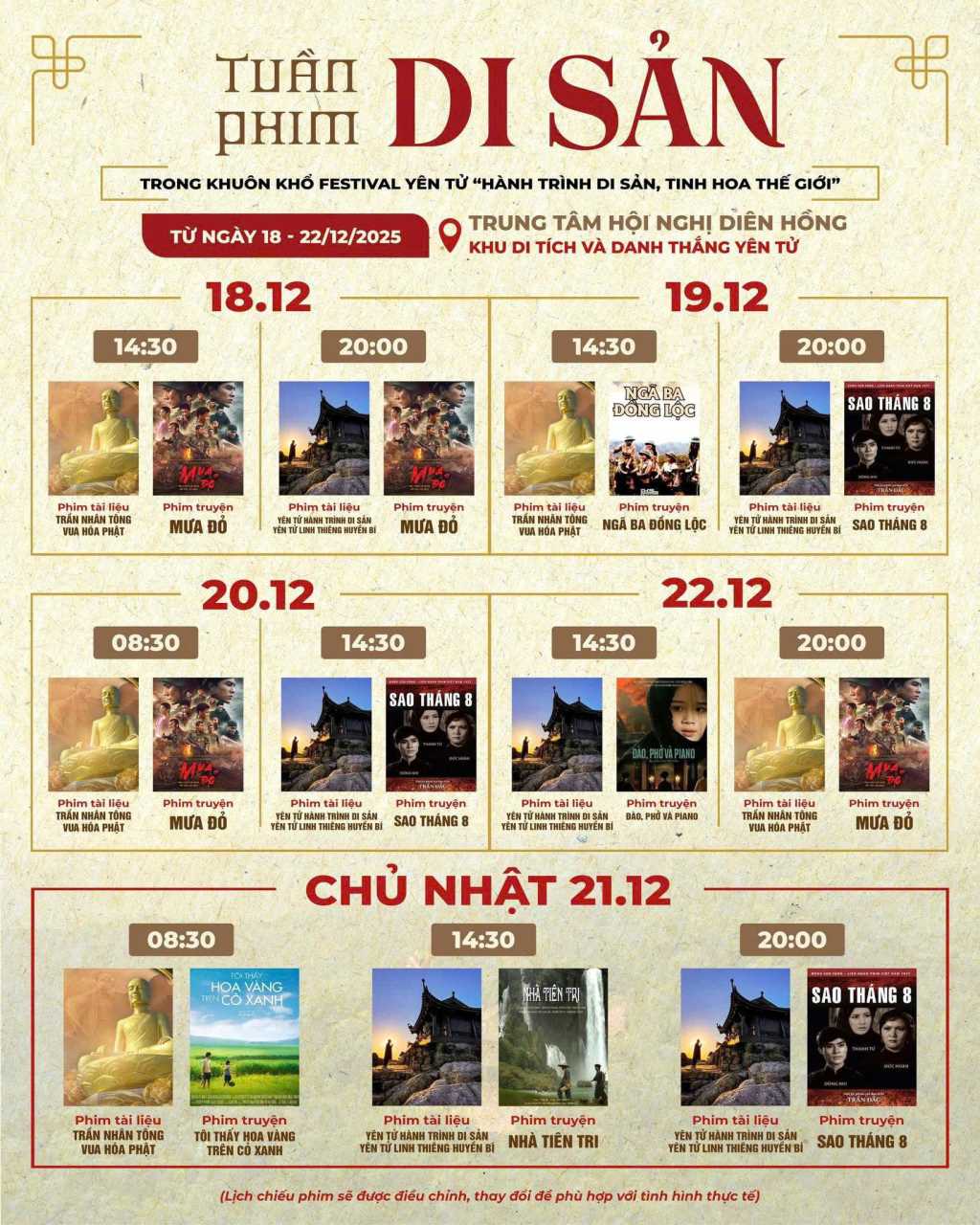 Còn tại Trung tâm Hội nghị Diên Hồng, Khu di tích và danh thắng Yên Tử (phường Yên Tử), từ 18-22/12, tỉnh Quảng Ninh tổ chức Tuần phim Di sản, trình chiếu các tác phẩm điện ảnh, phim tài liệu về đề tài cách mạng, lịch sử, văn hóa, tôn vinh anh hùng, danh nhân văn hóa, triều đại nhà Trần, lòng yêu nước và khát vọng cống hiến,... của dân tộc Việt Nam. Bên cạnh các bộ phim tài liệu như: "Trần Nhân Tông - Vua hóa Phật"; "Yên Tử hành trình di sản - Yên Tử linh thiêng huyền bí", sẽ có nhiều bộ phim nổi tiếng được trình chiếu như: "Mưa đỏ"; "Đào, Phở và Piano"; "Ngã ba Đồng Lộc"; "Tôi thấy hoa vàng trên cỏ xanh"; "Sao tháng 8". Quy mô mỗi suất chiếu từ 300-500 người. Hệ thống màn hình led và thiết bị âm thanh, ánh sáng hiện đại được sử dụng để bảo đảm chất lượng trình chiếu, tạo không gian sinh động, hấp dẫn.