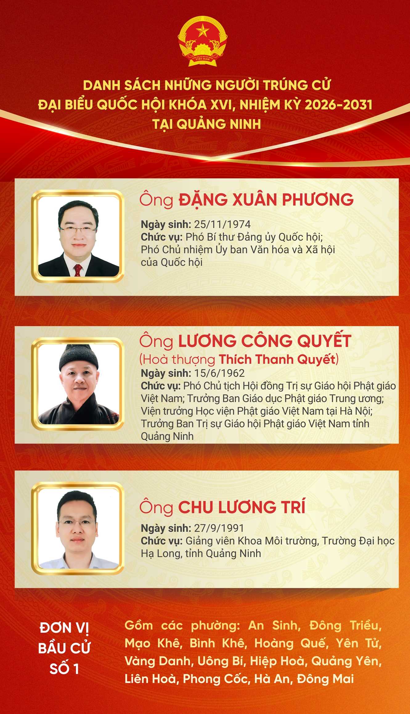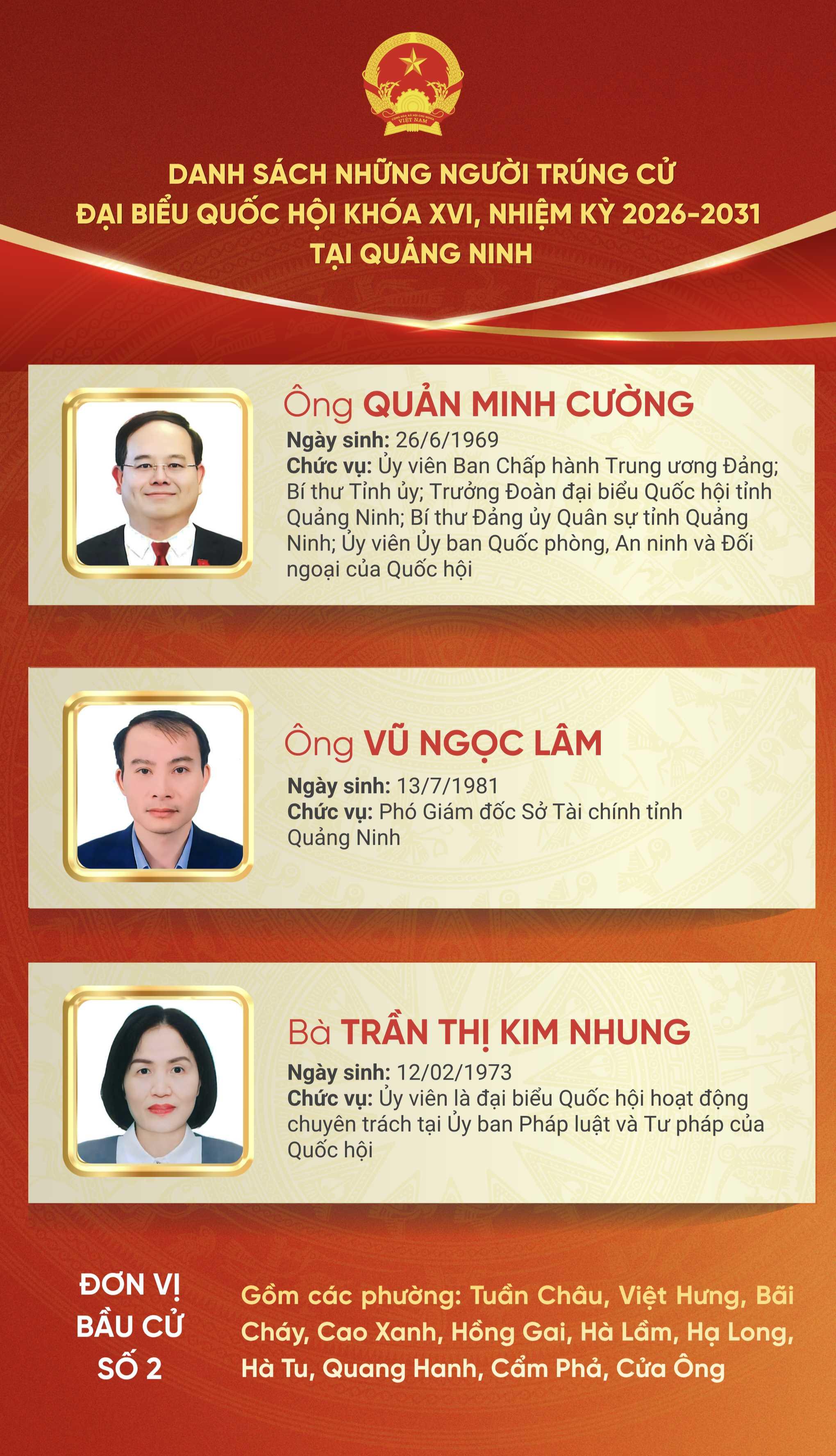Theo danh sách này, tỉnh Quảng Ninh có 9 người trúng cử đại biểu Quốc hội khoá XVI, nhiệm kỳ 2026-2031, tại 3 đơn vị bầu cử.