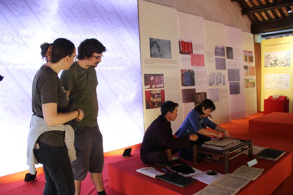 Du khách tìm hiểu về Mộc bản chùa Vĩnh Nghiêm tại triển lãm thành tựu “Di sản ngàn năm Yên Tử - Vĩnh Nghiêm - Côn Sơn, Kiếp Bạc”.