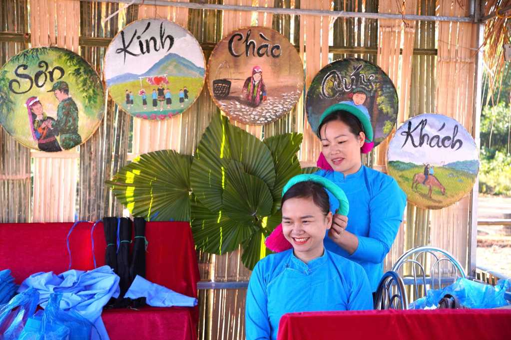 Một phụ nữ người Dao xã Hải Sơn sửa soạn cho chồng trước khi đi lễ hội.