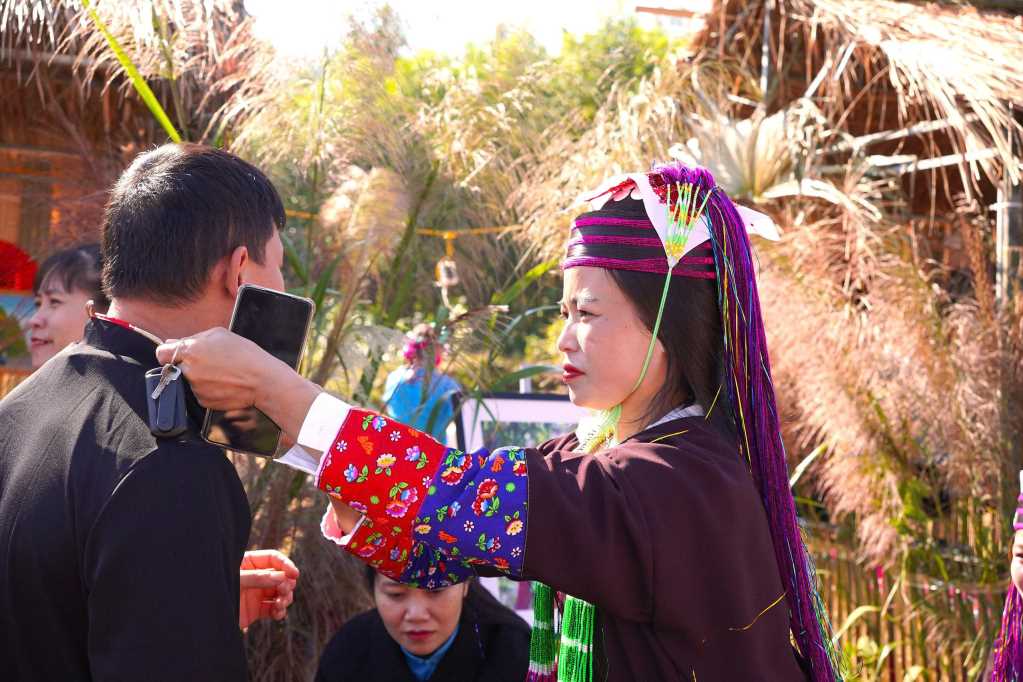 Đồng bào Sán Chỉ bày bán trang phục dân tộc cho du khách.