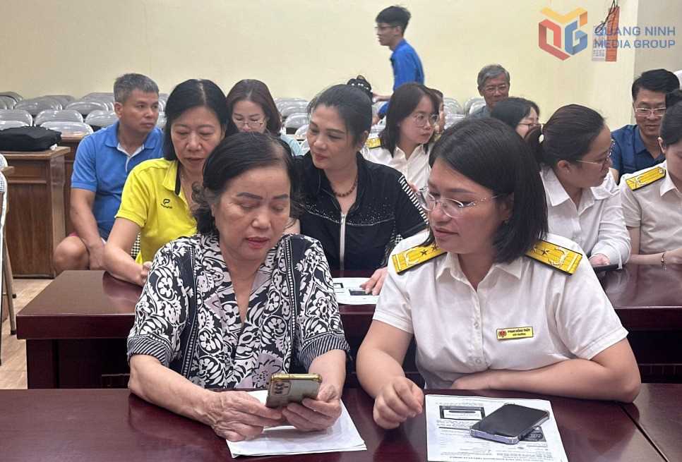 Cán bộ Thuế Cơ sở 1 Quảng Ninh hướng dẫn người dân phường Hồng Gai cài đặt eTax Mobile. Ảnh: Cao Quỳnh