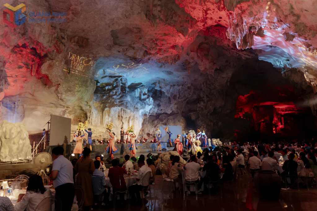 Du khách trải nghiệm show diễn "Đi tìm dấu ngọc" tại hang Ngọc Rồng.