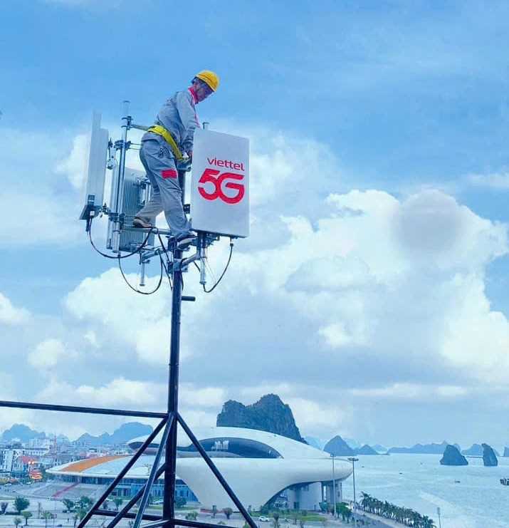 Cán bộ kỹ thuật Viettel Quảng Ninh thi công lắp đặt trạm phát sóng 5G ở các trọng điểm trên địa bàn toàn tỉnh. Ảnh: Hoàng Nga