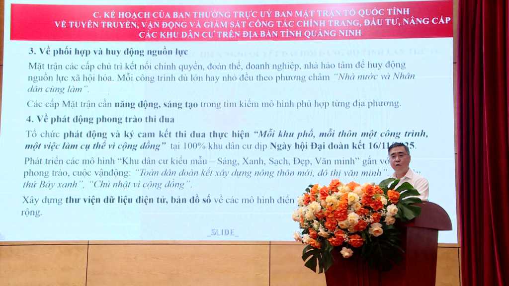 Tại hội nghị, đồng chí Nguyễn Chí Thành, Phó Chủ tịch Thường trực Ủy ban MTTQ Việt Nam tỉnh Quảng Ninh đã quán triệt các nội dung của Nghị quyết và Chương trình hành động số 01-CTr/TU ngày 6/10/2025 của Ban Chấp hành Đảng bộ tỉnh về thực hiện Nghị quyết Đại hội XVI của Đảng bộ tỉnh; Chương trình hành động số 05-CTr/ĐU (ngày 3/11/2025) của Ban Chấp hành Đảng bộ MTTQ tỉnh về thực hiện Nghị quyết Đại hội XVI của Đảng bộ tỉnh; Kế hoạch của Ban Thường trực Uỷ ban MTTQ tỉnh về tuyên truyền, vận động và giám sát chỉnh trang, đầu tư, nâng cấp các công trình hạ tầng, thiết chế văn hoá, khu vui chơi, thể thao và sinh hoạt cộng đồng tại các khu dân cư trên địa bàn tỉnh Quảng Ninh.