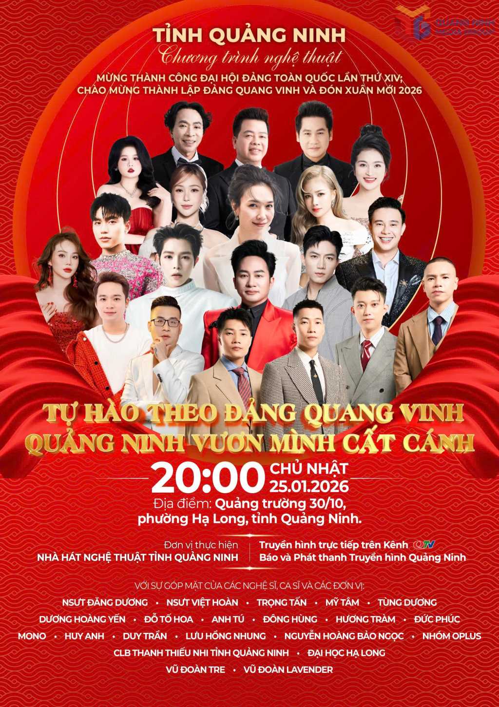 Theo đó, chương trình nghệ thuật mừng Đại hội Đảng toàn quốc lần thứ XIV; chào mừng thành lập Đảng quang vinh và đón Xuân mới 2026 với chủ đề “Tự hào theo Đảng quang vinh - Quảng Ninh vươn mình cất cánh” sẽ diễn ra vào ngày 25/1/2026 tại Quảng trường 30/10, phường Hạ Long. Chương trình không chỉ là điểm nhấn chính trị - văn hóa có ý nghĩa sâu sắc, mà còn là không gian sáng tạo giàu cảm xúc, khơi dậy niềm tự hào và khát vọng cống hiến.