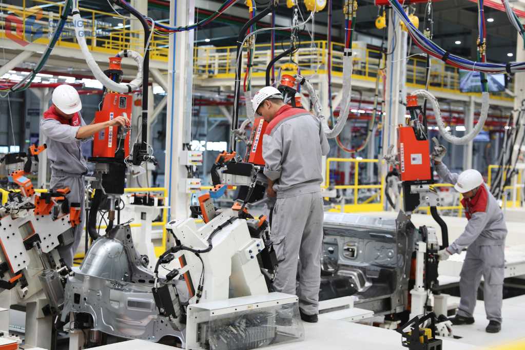 Công nhân Nhà máy ô tô Thành Công Việt Hưng (KCN Việt Hưng) vận hành hệ thống lắp ráp linh kiện xe.
