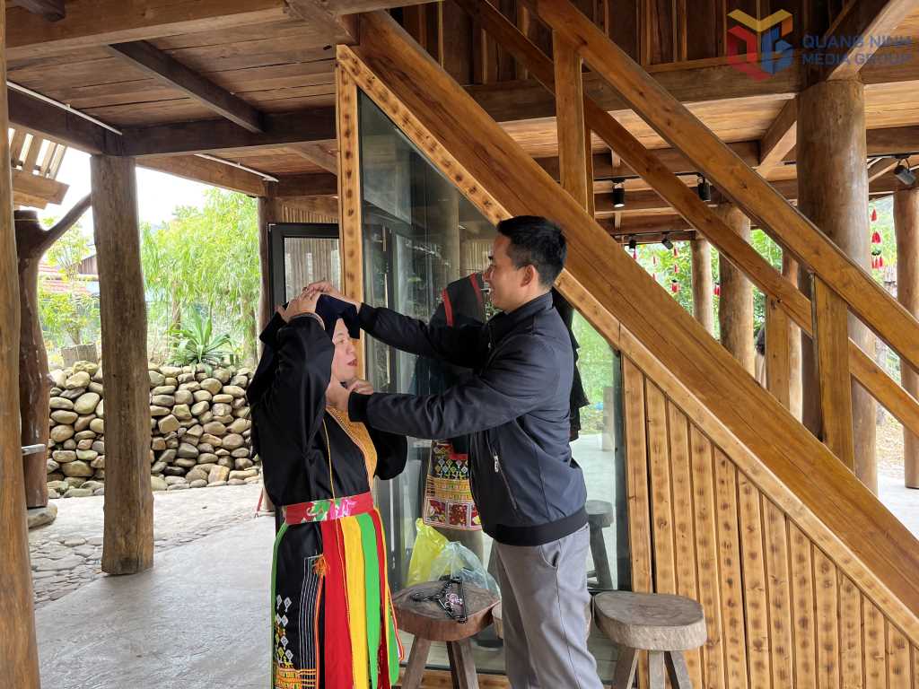 Du khách trải nghiệm mặc trang phục truyền thống người dân tộc Dao tại khu du lịch Kỳ Thượng Am Váp.