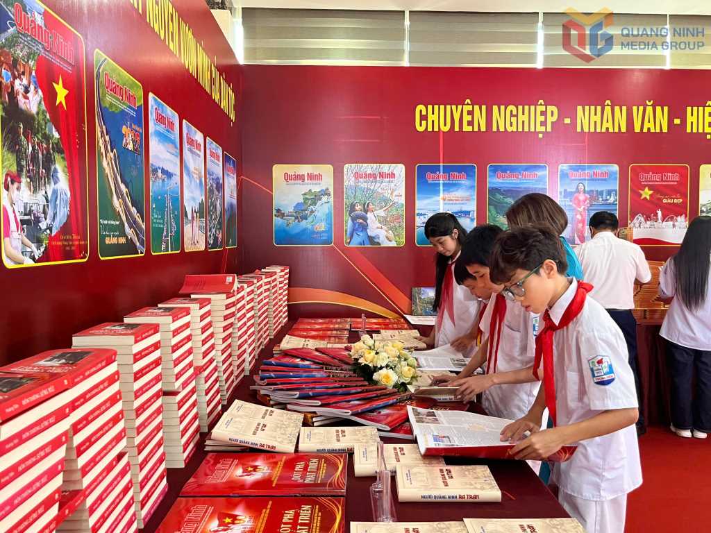 Các em học sinh tham quan, đọc các ấn phẩm báo chí đặc biệt của Báo và Phát thanh, Truyền hình Quảng Ninh ra mắt chào mừng Đại hội Đảng bộ tỉnh lần thứ XVI.