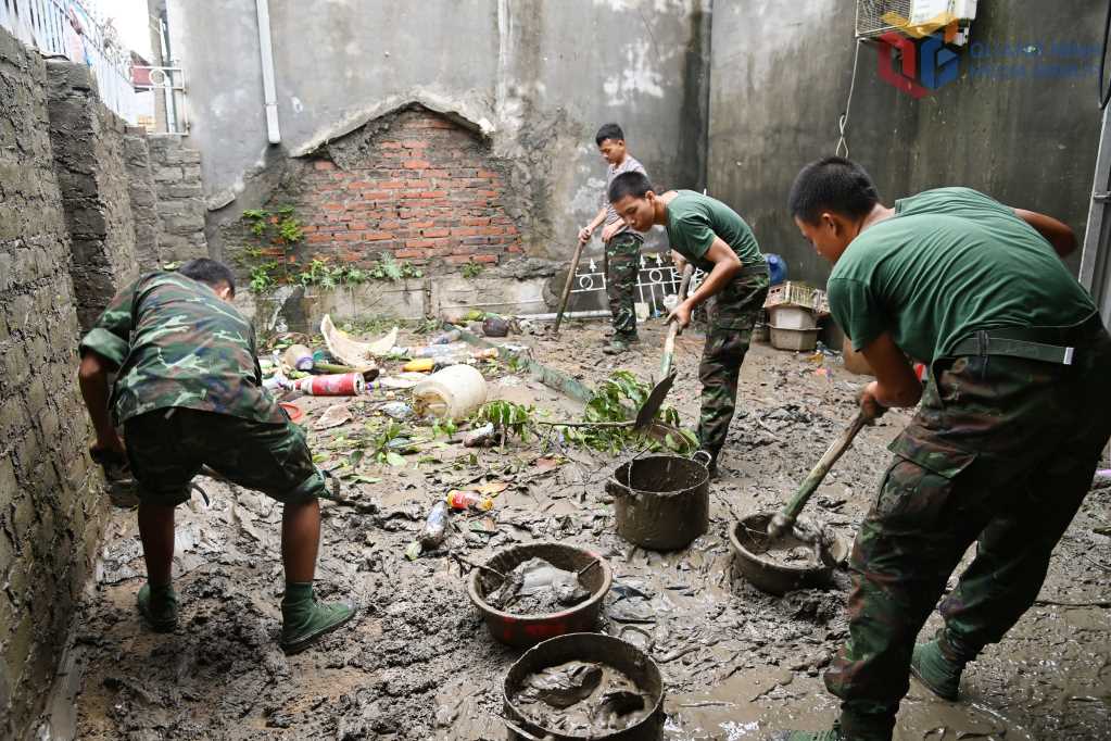 Cán bộ, chiến sĩ Ban Chỉ huy PTKV 1 - Quảng Hà giúp dân khắc phục hậu quả sau bão lũ.