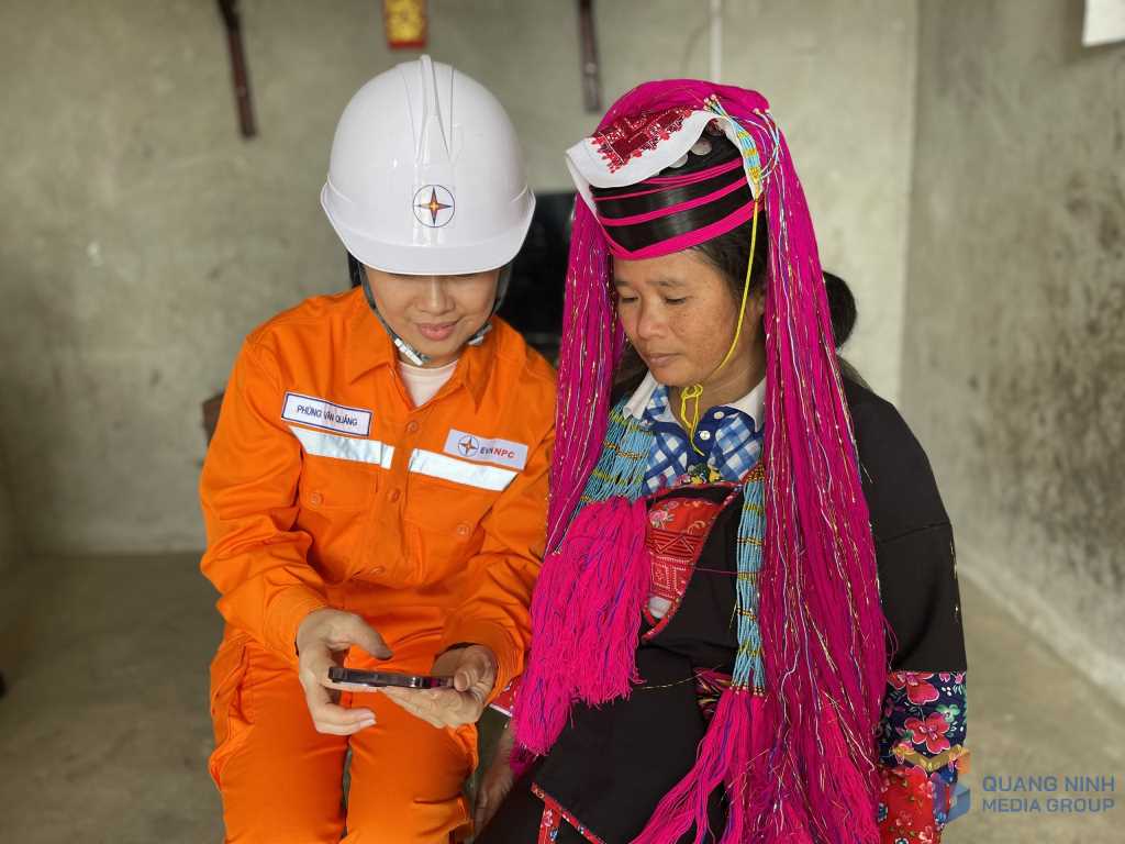 Công nhân Đội Quản lý điện lực khu vực Hải Hà hướng dẫn người dân xã Đường Hoa thanh toán tiền điện trực tuyến.