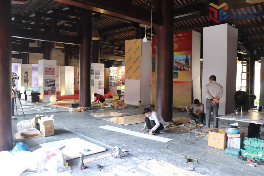 Khu vực triển lãm thành tựu Di sản ngàn năm Yên Tử - Vĩnh Nghiêm - Côn Sơn, Kiếp Bạc đang được các đơn vị triển khai lắp đặt.