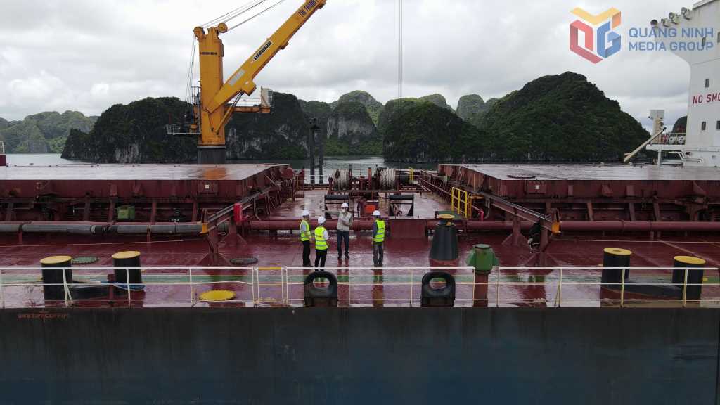 Nhân viên Công ty CP Phát triển công nghệ Cyberlogistics Việt Nam triển khai dịch vụ logistics cho tàu hàng tại vùng neo Hạ Long.