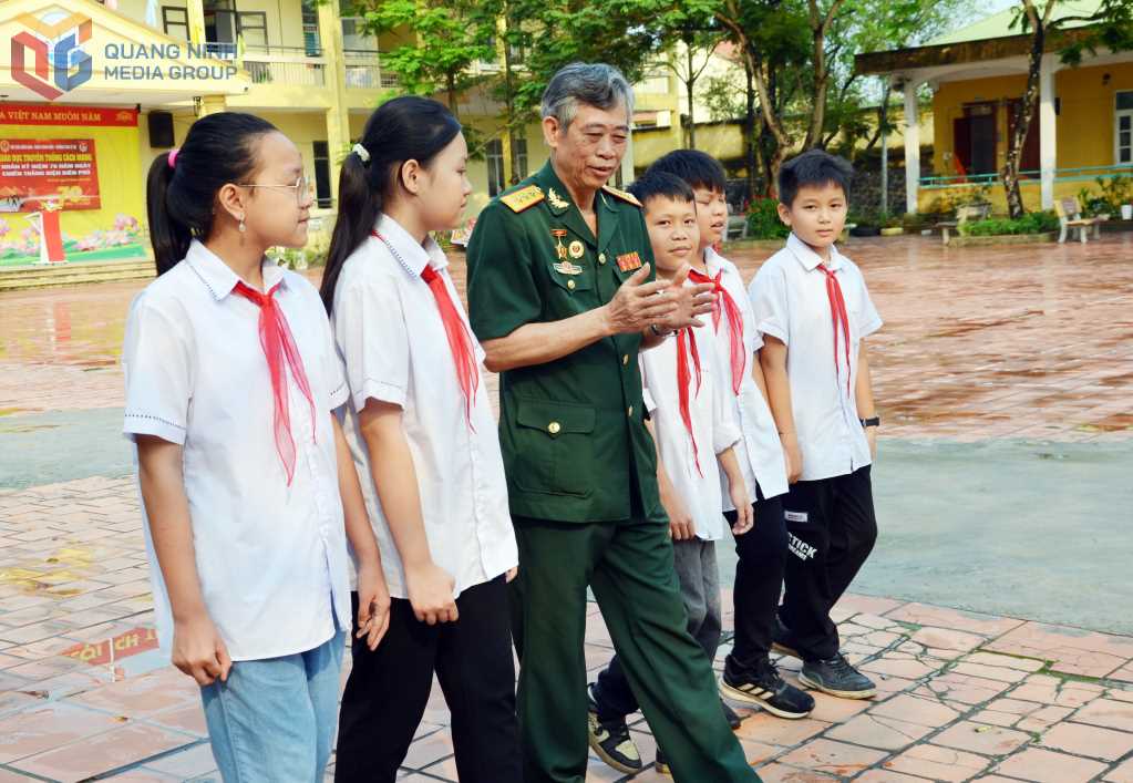 CCB Trần Quốc Mạnh (phường Hoành Bồ) kể lại những câu chuyện ông đã trực tiếp tham gia chiến dịch giải phóng Sài Gòn 50 năm trước cho học sinh Trường THCS Lê Lợi. Ảnh: Dương Trường