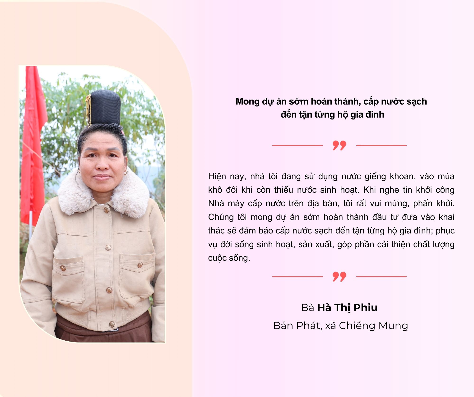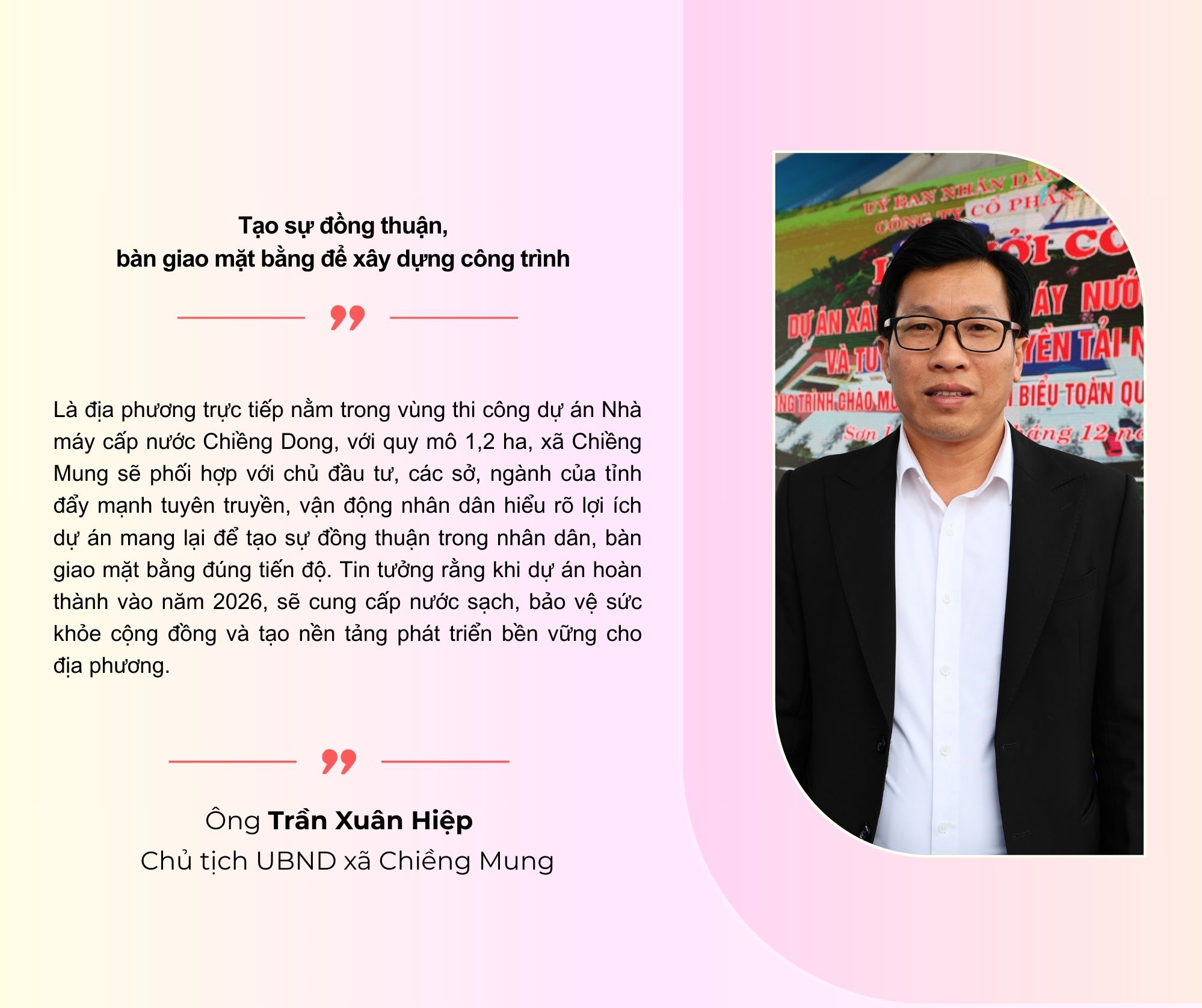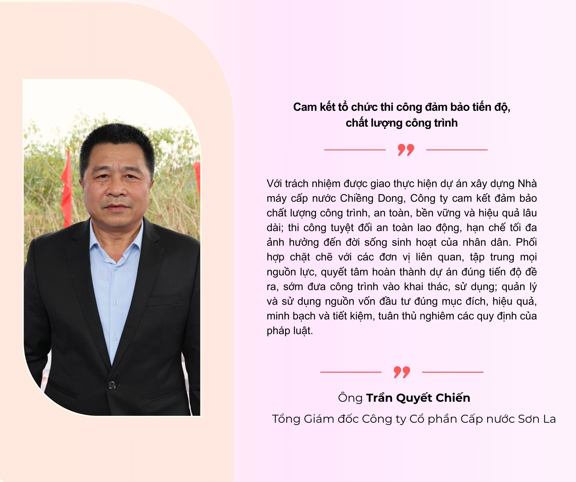 Phát biểu tại Lễ khởi công, đồng chí Chá A Của, Phó Bí thư Tỉnh ủy, Chủ tịch Ủy ban MTTQ Việt Nam tỉnh khẳng định: Thời gian qua, tỉnh Sơn La luôn dành sự quan tâm đặc biệt cho công tác cấp nước sạch, để nâng cao chất lượng cuộc sống, hướng tới mục tiêu phát triển đô thị văn minh, hiện đại. Dự án Nhà máy nước Chiềng Dong được triển khai với mục tiêu giải quyết dứt điểm tình trạng thiếu nước sạch sinh hoạt, nâng cao sức khỏe cộng đồng và chất lượng cuộc sống của nhân dân. Công trình hoàn thành sẽ tạo tiền đề vững chắc cho việc phát triển sản xuất, kinh doanh, dịch vụ trên địa bàn, đảm bảo an sinh xã hội và góp phần thúc đẩy kinh tế - xã hội địa phương.