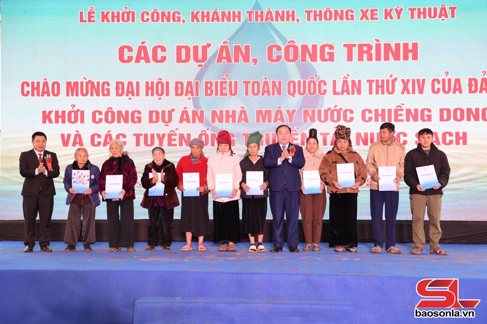 Các đại biểu đã thực hiện nghi thức khởi công Dự án xây dựng Nhà máy cấp nước Chiềng Dong; trao quà cho các hộ gia đình tại xã Chiềng Mung và Chiềng Mai.