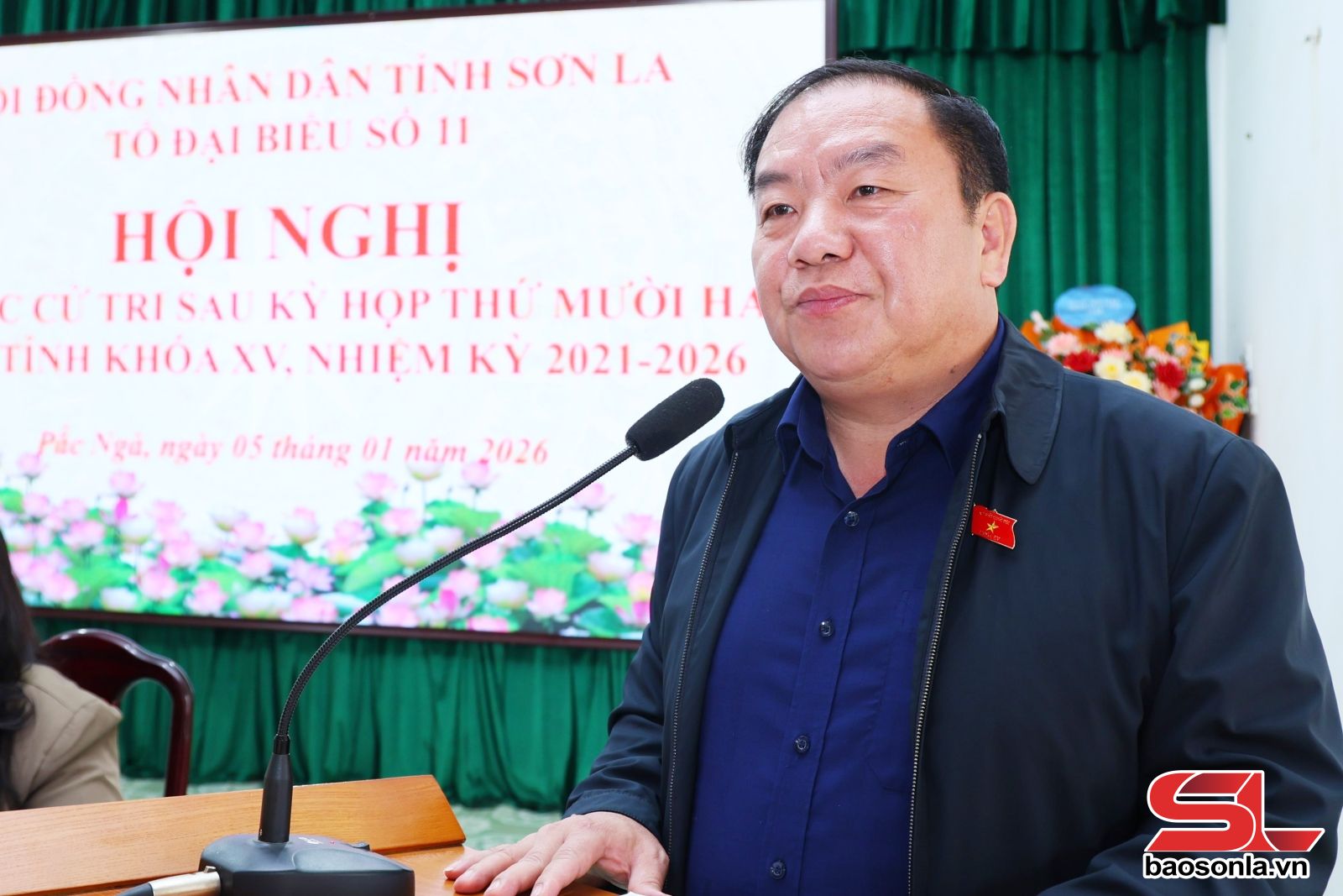 Cử tri xã Pắc Ngà kiến nghị các cấp, các ngành quan tâm xem xét, đưa dự án xây dựng cầu qua sông Đà tại khu vực xã Pắc Ngà sang xã Tà Hộc vào quy hoạch phát triển giao thông và kế hoạch đầu tư công trung hạn, dài hạn giai đoạn 2026-2030; đầu tư xây dựng trụ sở làm việc cho xã; trang bị cơ sở vật chất phục vụ công tác quản lý nhà nước, cải cách hành chính và chuyển đổi số; đầu tư làm đường bê tông từ bản Suối Cải đi bản Cải B và từ bản Nà Sài đi khu Lềnh Tiến thuộc bản Nà Tiến; bố trí kinh phí xây mới, sửa chữa, nâng cấp nhà văn hóa các bản; hỗ trợ, trang bị bộ thiết bị thu nhận hồ sơ căn cước công dân cho Công an xã Pắc Ngà.