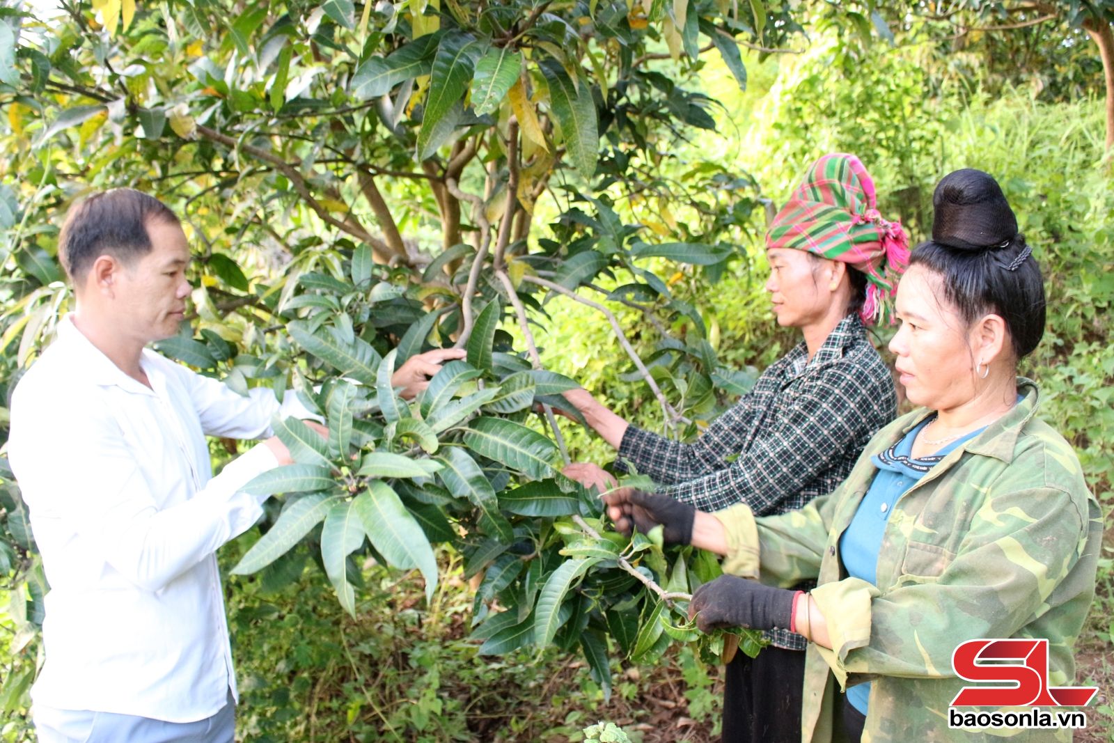 Bí thư Chi bộ bản Huổi Ná, xã Quỳnh Nhai hướng dẫn nhân dân chăm sóc cây ăn quả.