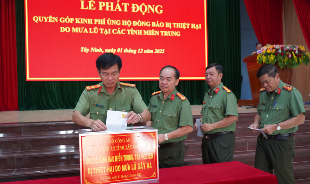 Thời gian qua, mưa, bão, lũ quét gây ảnh hưởng nghiêm trọng đến tính mạng, tài sản của Nhân dân tại các tỉnh miền Trung và Tây Nguyên. Phát huy truyền thống đoàn kết, tinh thần “tương thân, tương ái” của lực lượng Công an Nhân dân, Công an tỉnh Tây Ninh phát động cán bộ, chiến sĩ toàn lực lượng đóng góp ủng hộ, góp phần chia sẻ khó khăn với đồng bào bị thiệt hại do mưa, lũ.