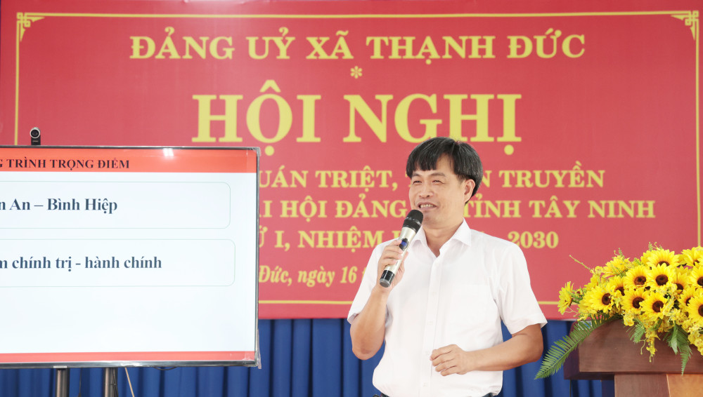 Bí thư Đảng ủy, Chủ tịch HĐND xã Thạnh Đức Phạm Vũ Anh Thi yêu cầu các chi bộ, đảng bộ cơ sở, các cơ quan, đơn vị tiếp tục triển khai quán triệt và đẩy mạnh công tác tuyên truyền bằng nhiều hình thức nhằm sớm đưa Nghị quyết Đại hội Đại biểu Đảng bộ tỉnh cũng như Nghị quyết Đại hội Đại biểu Đảng bộ xã Thạnh Đức lần thứ I, nhiệm kỳ 2025 – 2030 vào thực tiễn đời sống.