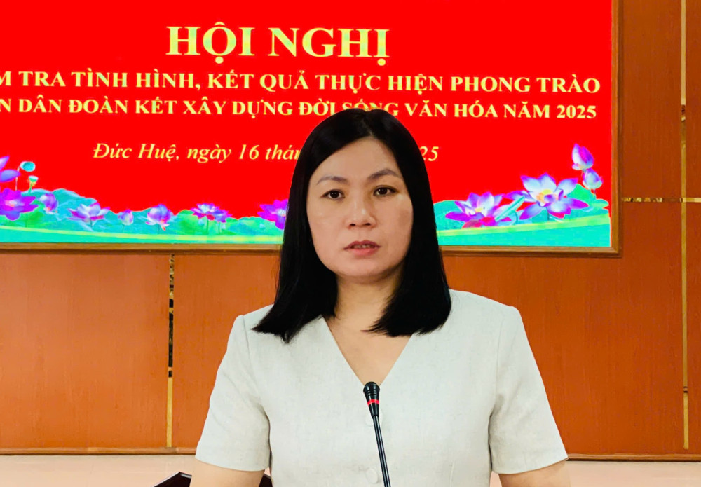 Phát biểu kết luận, Phó Trưởng ban Tuyên giáo và Dân vận Tỉnh ủy Mai Đặng Thảo Nguyên đánh giá việc triển khai thực hiện phong trào “Toàn dân đoàn kết xây dựng đời sống văn hóa” tại xã Đức Huệ đạt nhiều kết quả tích cực, công tác bình xét các danh hiệu văn hóa được thực hiện dân chủ, công khai; việc xây dựng và thực hiện quy ước khu dân cư đi vào nền nếp, góp phần giữ gìn an ninh trật tự, phát huy tình làng nghĩa xóm.