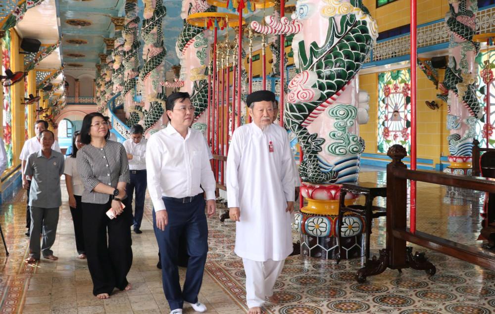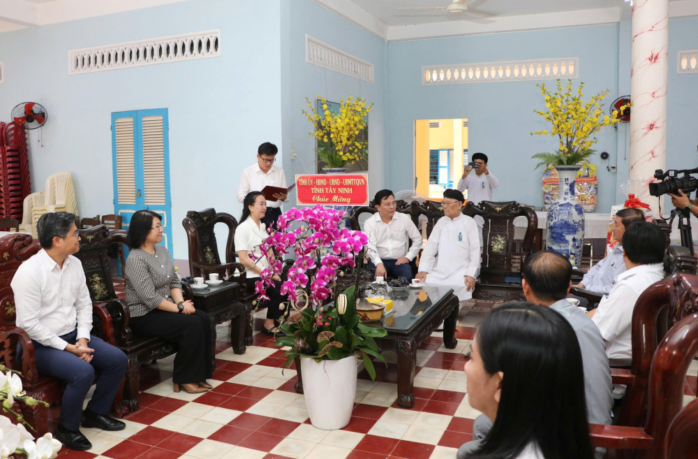 Thay mặt Thường trực Tỉnh ủy, Phó Bí thư Tỉnh ủy, Chủ tịch UBMTTQ Việt Nam tỉnh Nguyễn Thanh Hải trao tặng lẵng hoa và quà chúc mừng Hội thánh. Sau buổi thăm và chúc mừng, Đoàn công tác tham quan Cửu Trùng Đài - một hạng mục kiến trúc quan trọng, mang ý nghĩa đặc biệt trong tổng thể Đền thánh Tòa thánh Cao Đài Tây Ninh./.