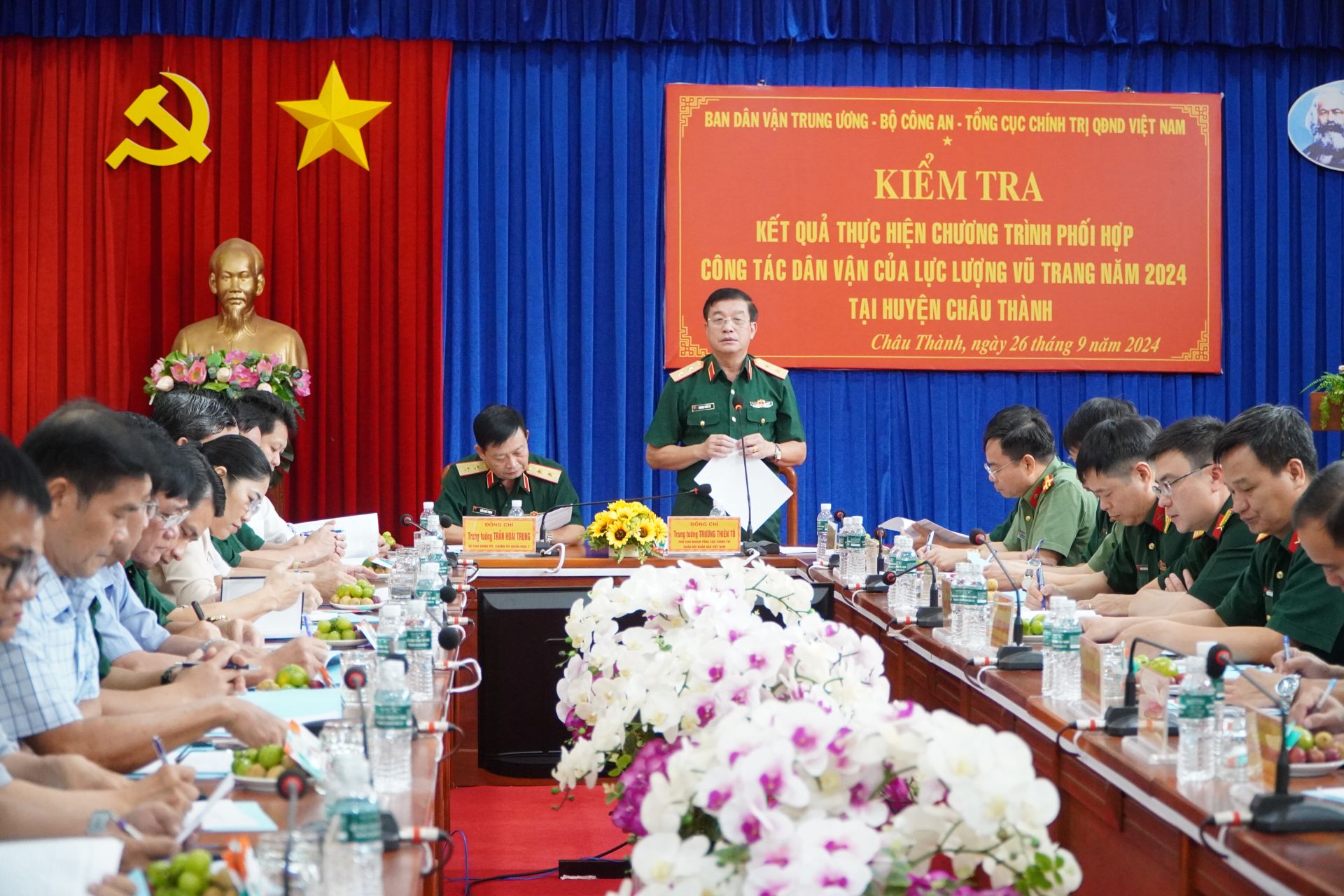 Phát biểu kết luận tại buổi kiểm tra, Trung tướng Trương Thiên Tô- Phó Chủ nhiệm Tổng cục Chính trị QĐND Việt Nam đánh giá cao những kết quả Chương trình phối hợp công tác dân vận của lực lượng vũ trang trên địa bàn huyện Châu Thành trong thời gian qua.