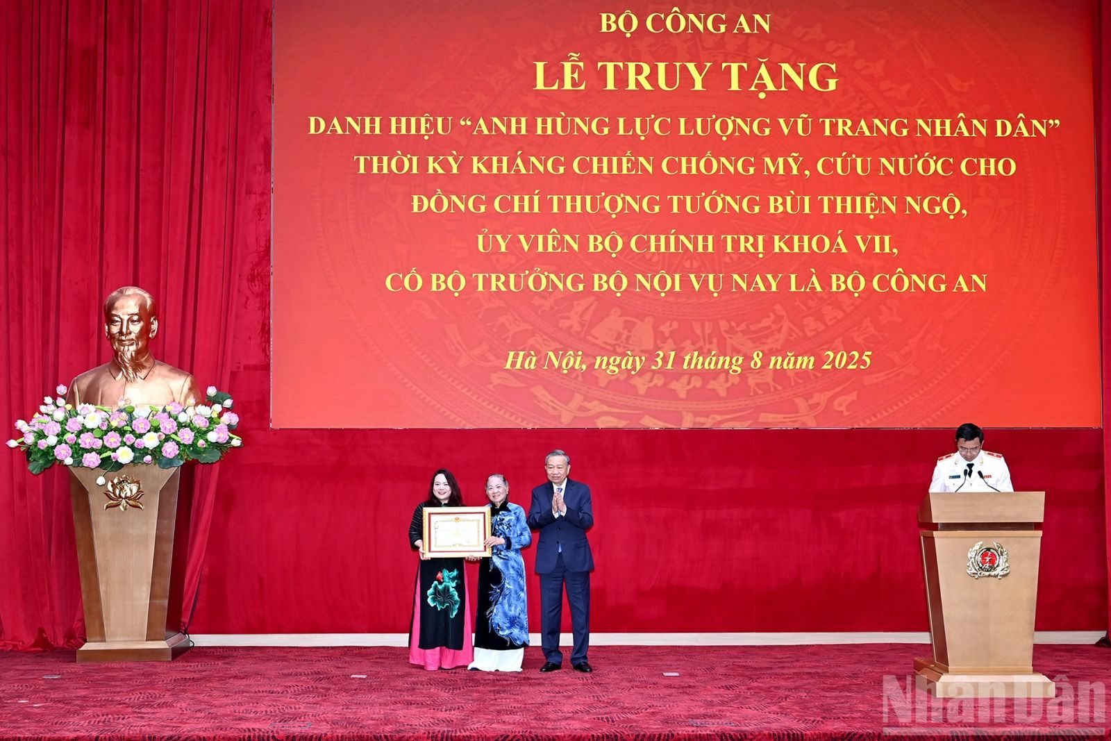 Sáng 31/8, tại Hà Nội, Tổng Bí thư Tô Lâm dự Lễ truy tặng Danh hiệu Anh hùng Lực lượng vũ trang nhân dân thời kỳ kháng chiến chống Mỹ, cứu nước cho đồng chí Thượng tướng Bùi Thiện Ngộ, Ủy viên Bộ Chính trị khóa VII, cố Bộ trưởng Nội vụ, nay là Bộ Công an.