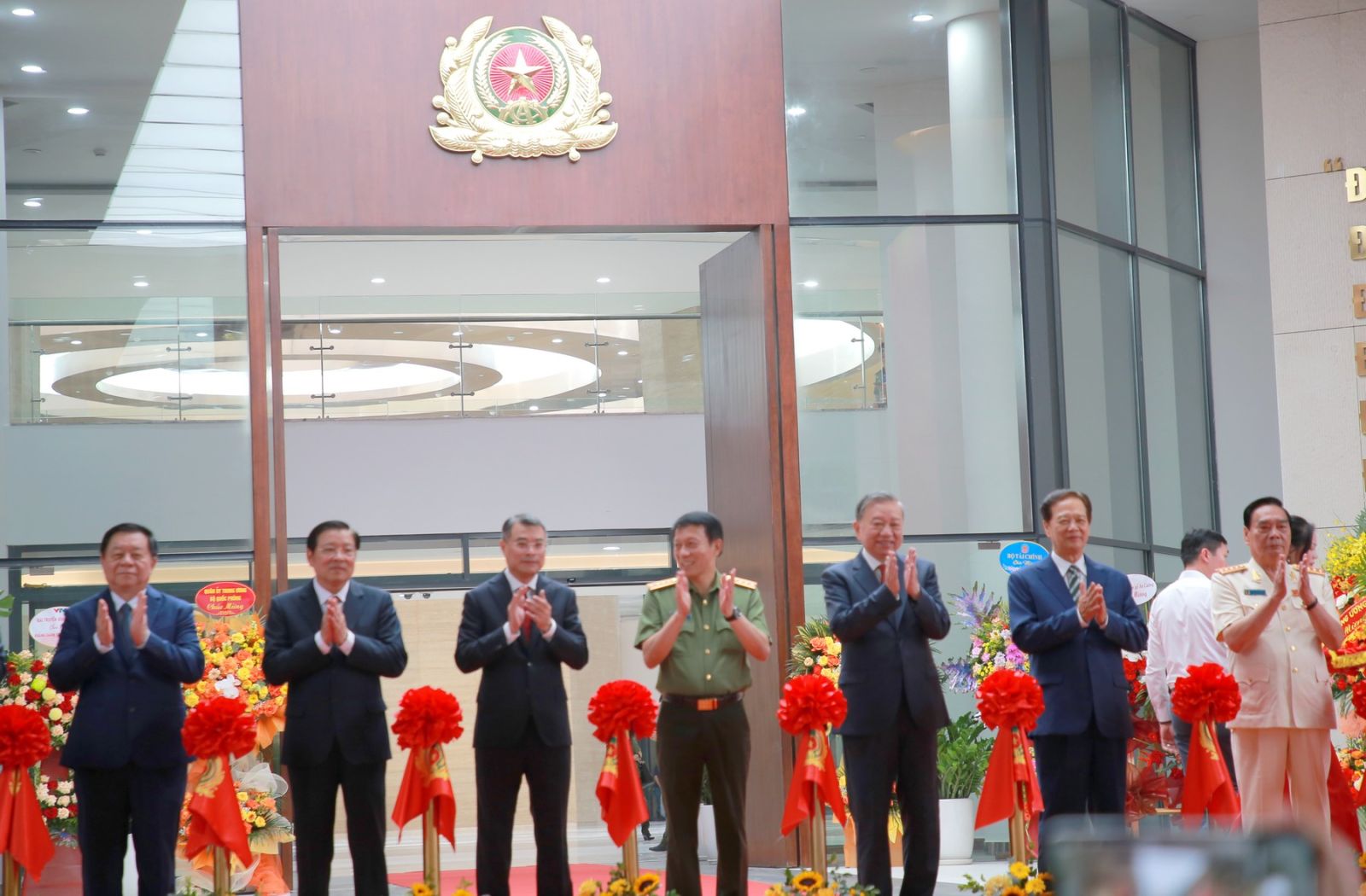 Tổng Bí thư Tô Lâm và các đồng chí Lãnh đạo cắt băng khánh thành Trụ sở mới Bộ Công an.