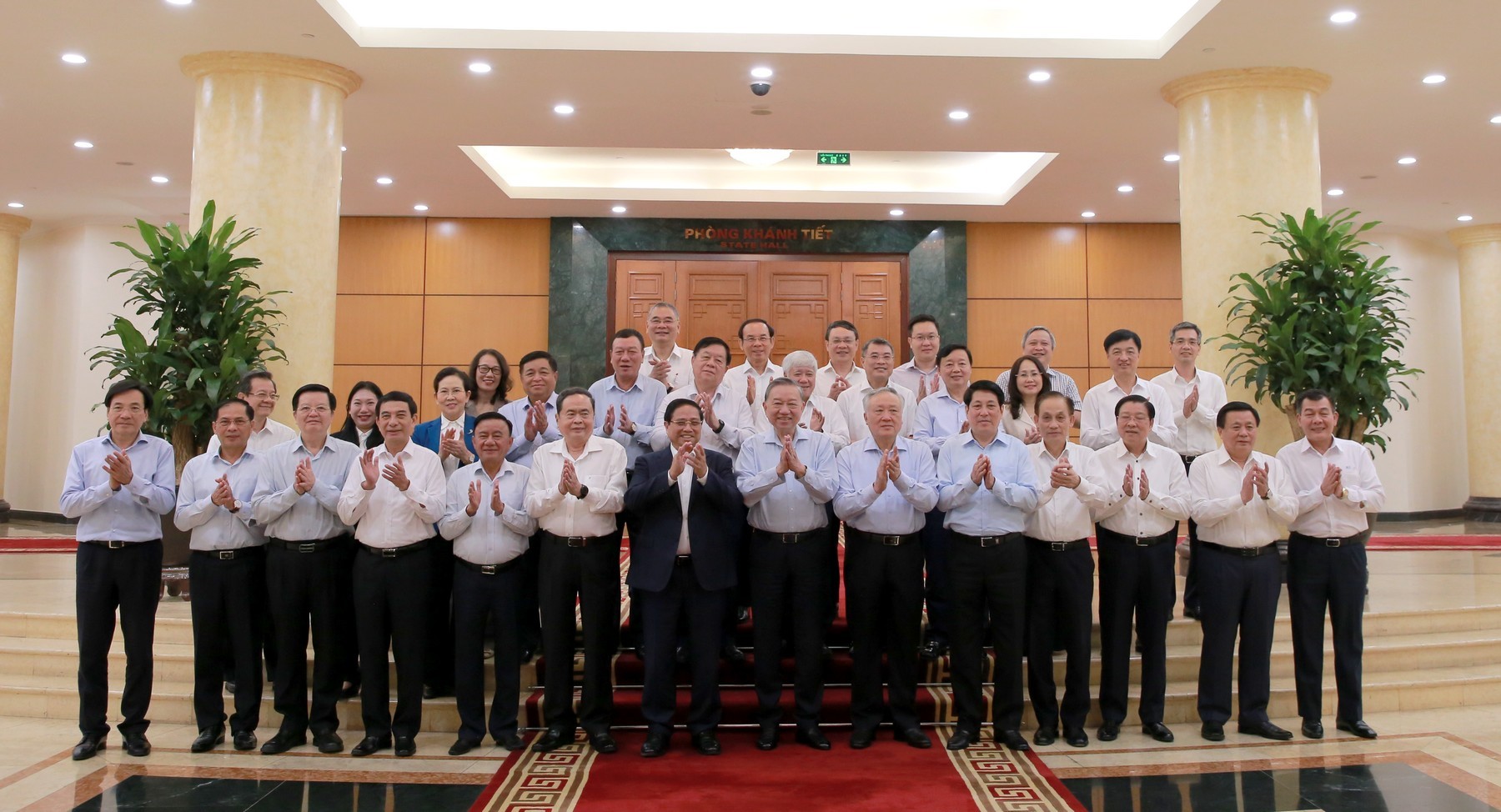 Tổng Bí thư Tô Lâm và các đồng chí lãnh đạo Đảng, Nhà nước với Ban Thường vụ Đảng ủy Chính phủ.