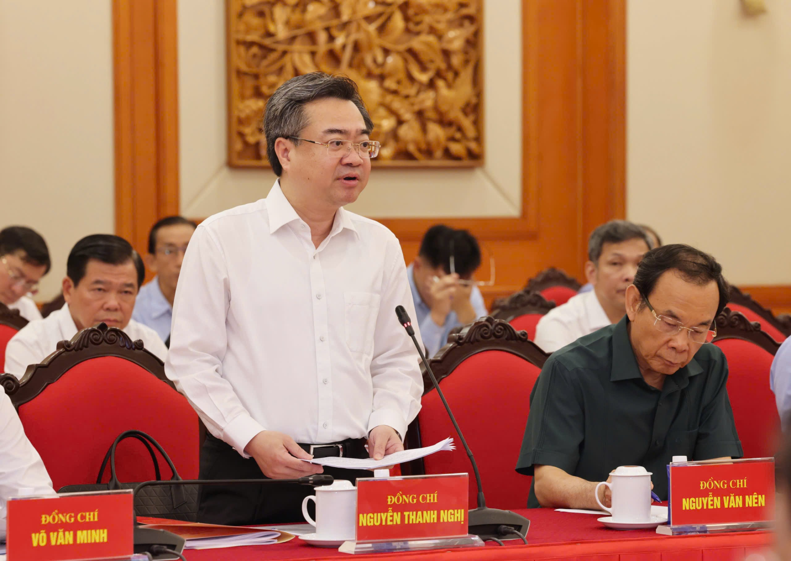 Đồng chí Nguyễn Thanh Nghị, Ủy viên Trung ương Đảng, Phó Bí thư Thường trực Thành ủy Thành phố Hồ Chí Minh thay mặt Ban Thường vụ báo cáo tại buổi làm việc.