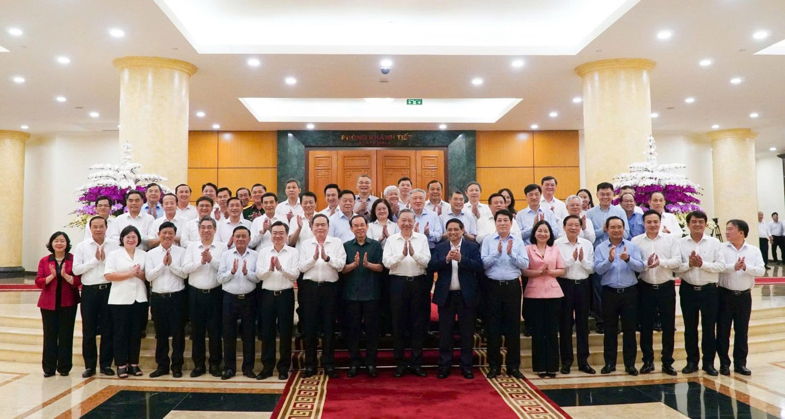 Tổng Bí thư Tô Lâm và các đồng chí Ủy viên Bộ Chính trị chụp ảnh lưu niệm cùng Ban Thường vụ Thành ủy Thành phố Hồ Chí Minh.