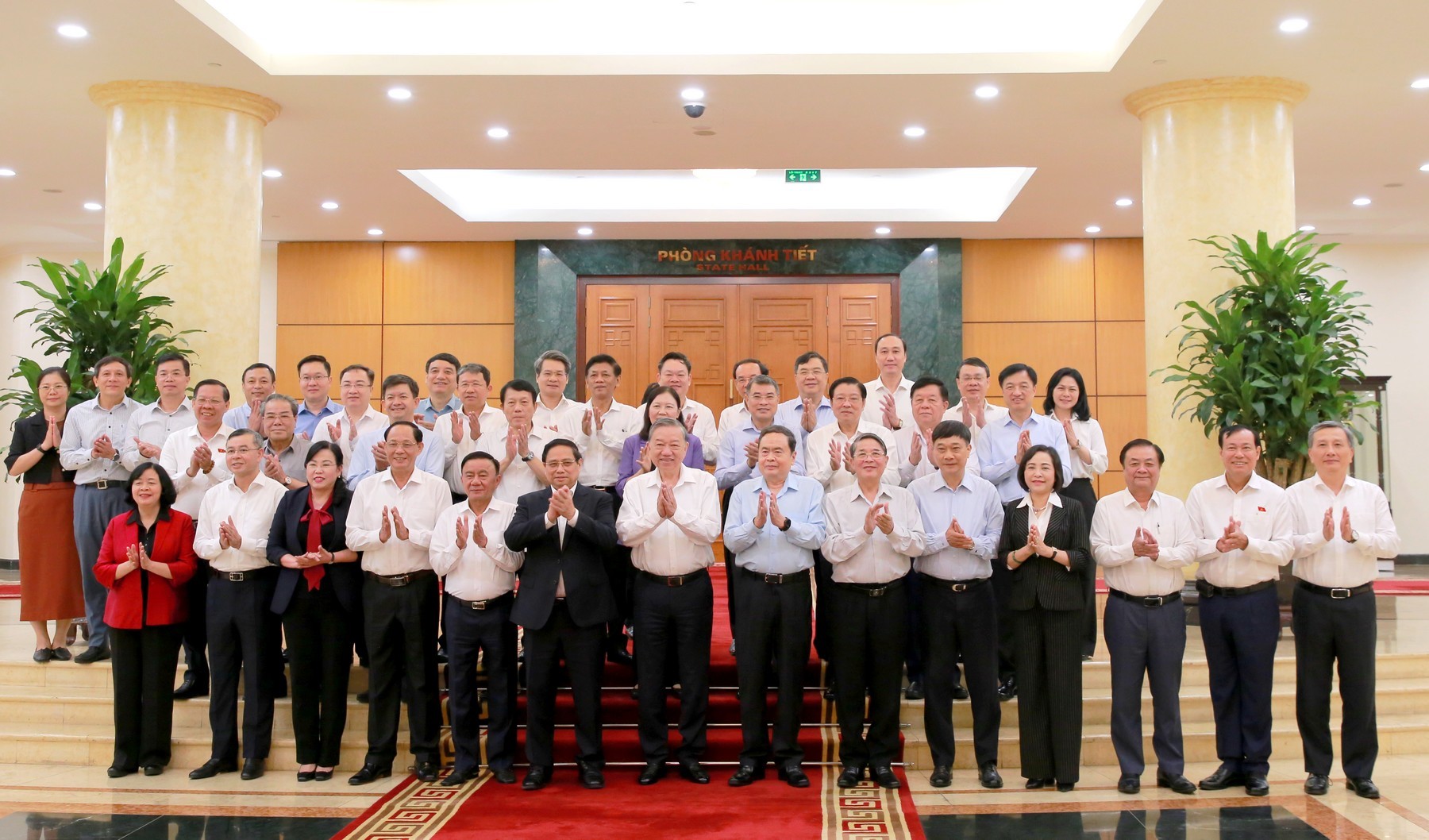 Tổng Bí thư Tô Lâm và các đồng chí lãnh đạo Đảng, Nhà nước chụp ảnh lưu niệm với Ban Thường vụ Đảng ủy Quốc hội.