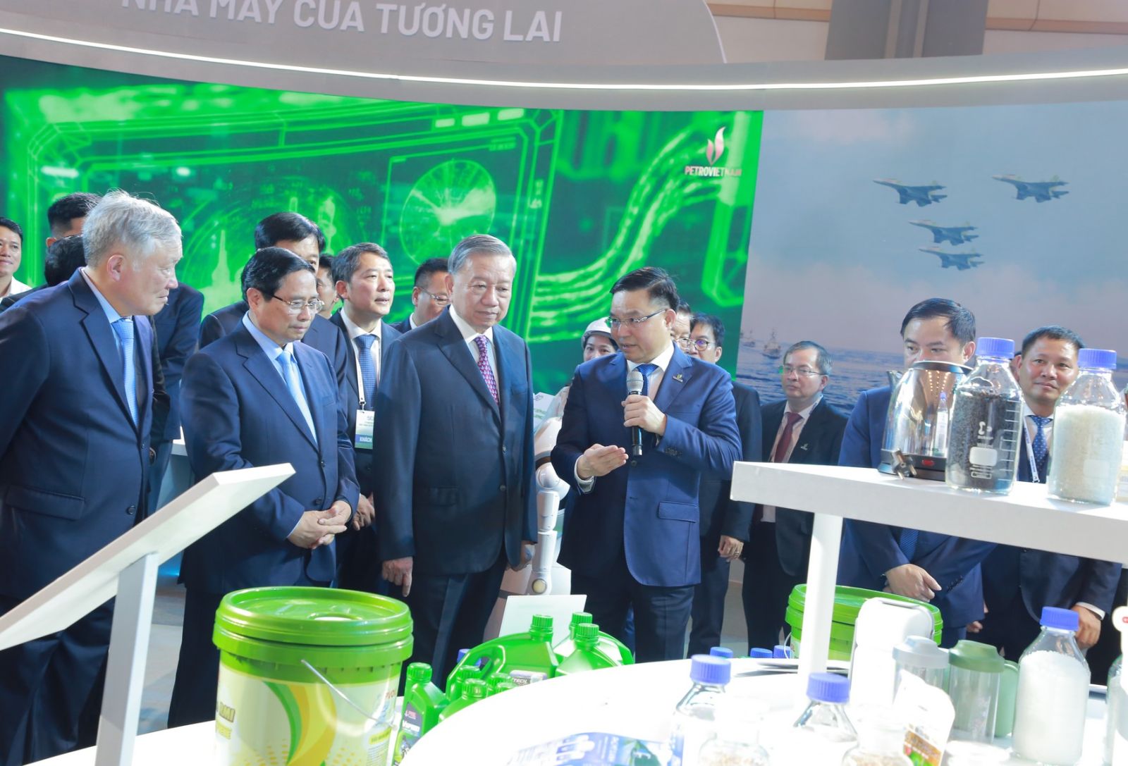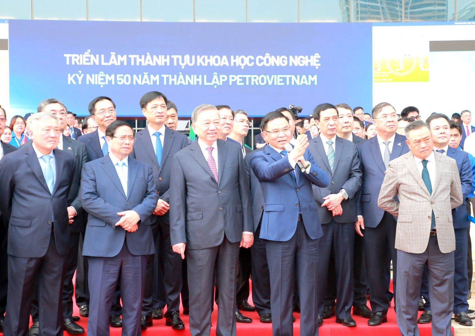 Tổng Bí thư Tô Lâm, Thủ tướng Phạm Minh Chính và các đồng chí lãnh đạo Đảng, Nhà nước tham quan triển lãm thành tựu khoa học công nghệ của Tập đoàn Công nghiệp - Năng lượng quốc gia Việt Nam.