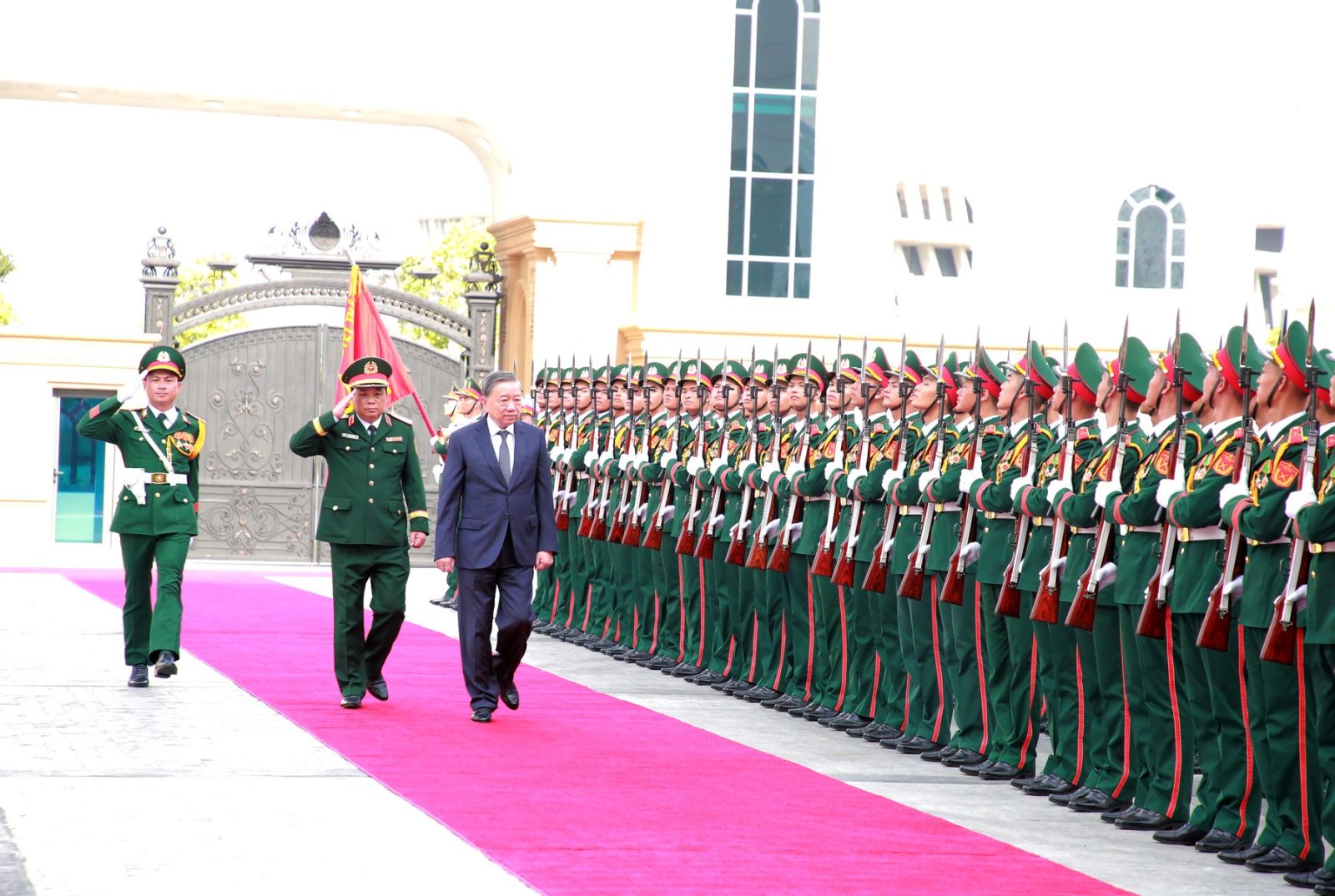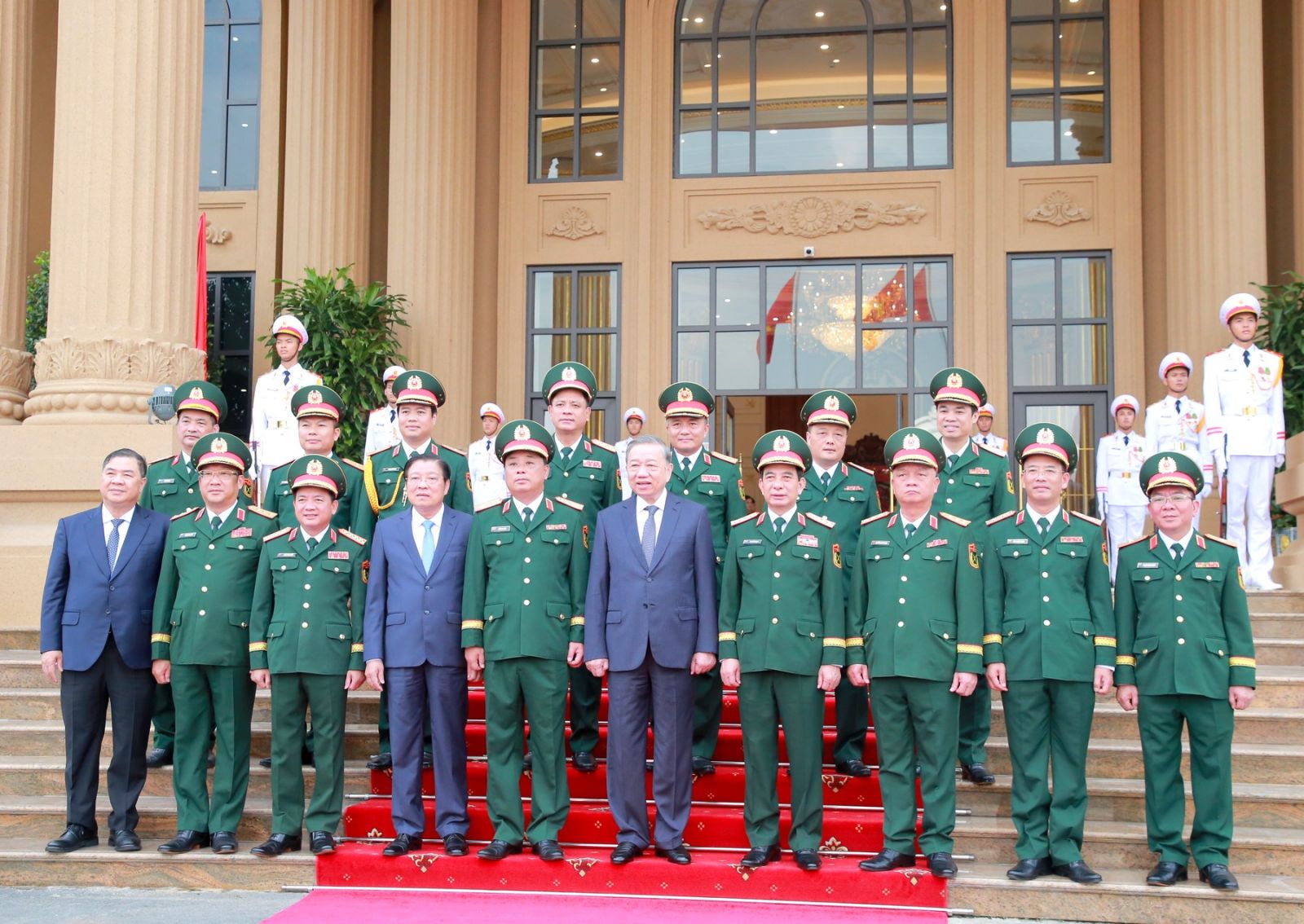 Đại tướng Phan Văn Giang, Ủy viên Bộ Chính trị, Phó Bí thư Quân ủy Trung ương, Bộ trưởng Bộ Quốc phòng cùng các đồng chí lãnh đạo Bộ Quốc phòng đón Tổng Bí thư Tô Lâm.