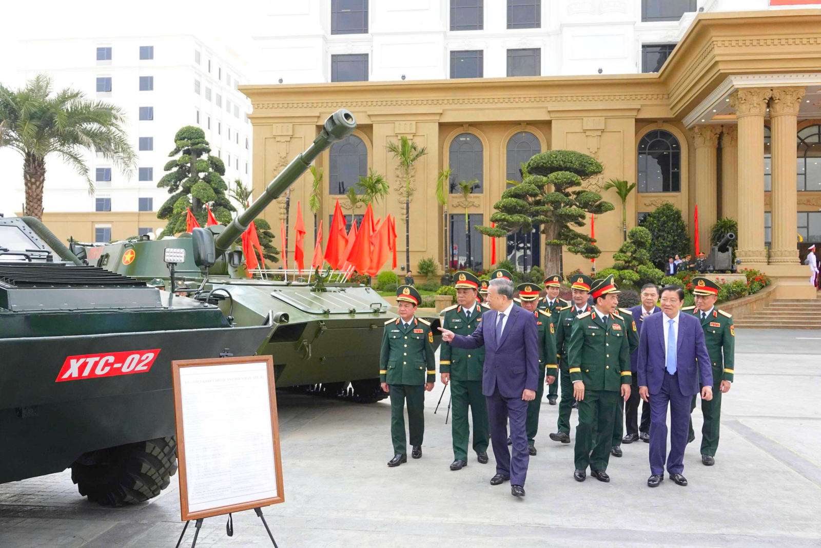 Tổng Bí thư Tô Lâm và các đại biểu tham quan thành tựu 80 năm Tổng cục Công nghiệp quốc phòng.