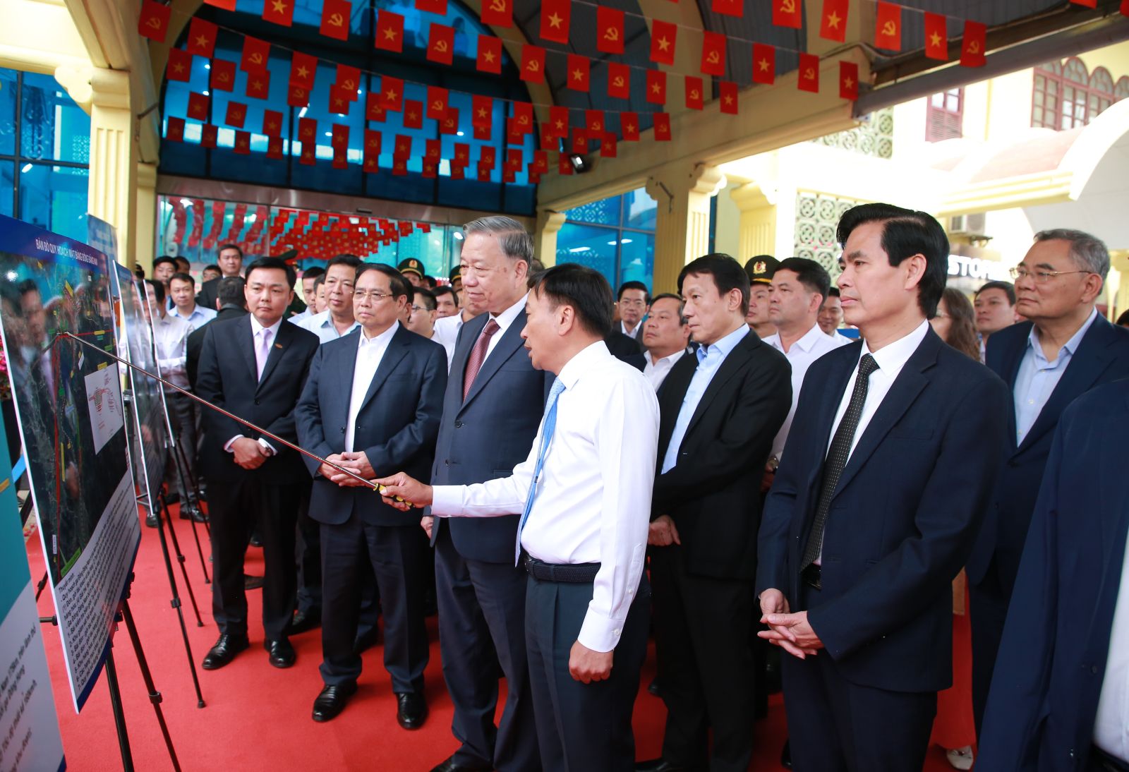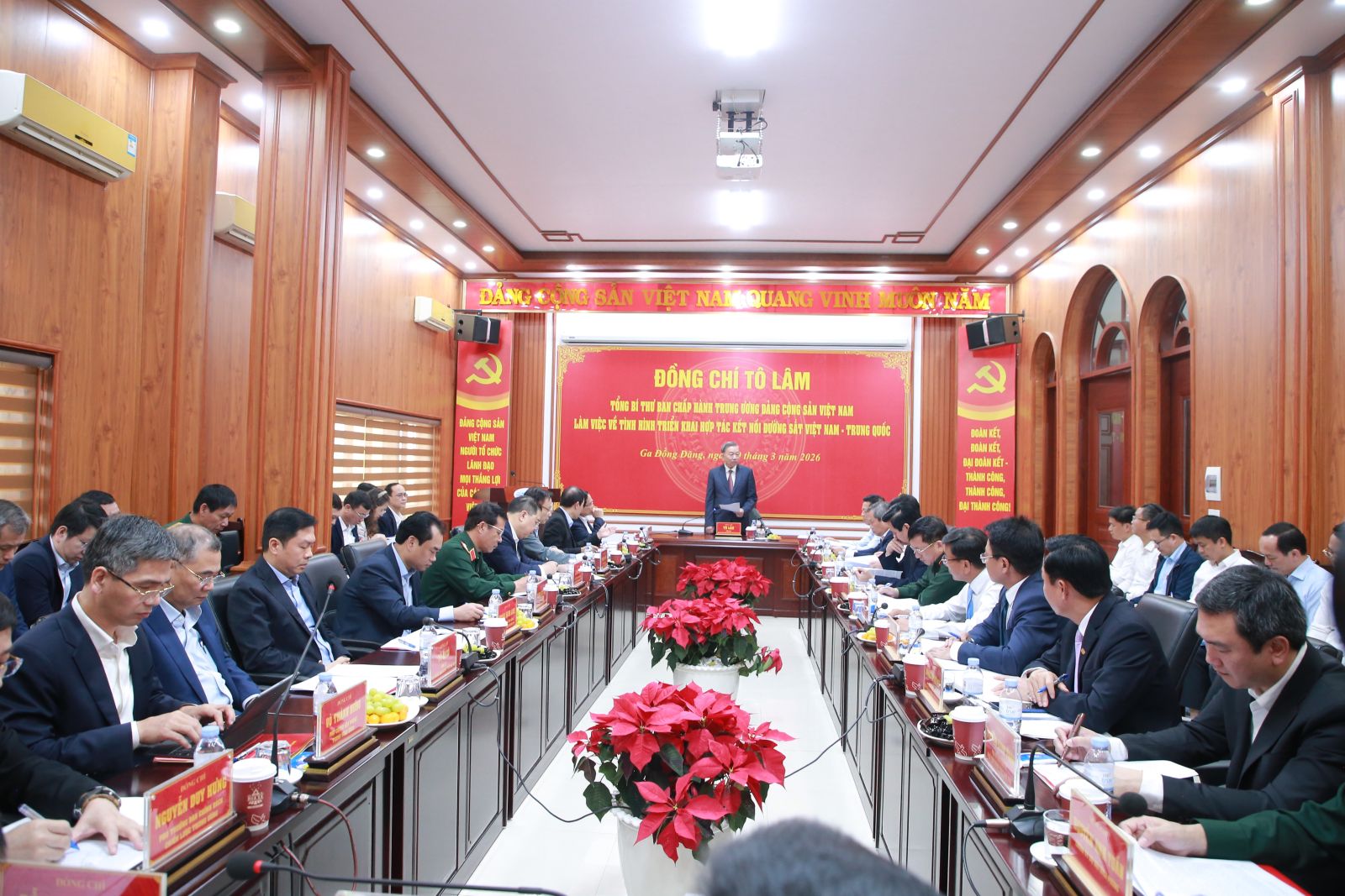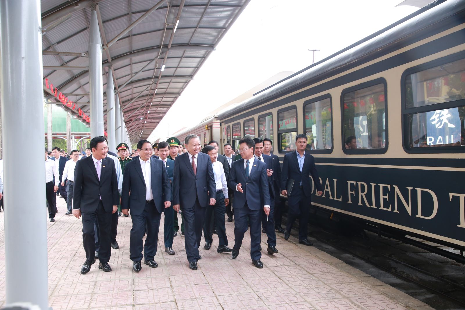 Tổng Bí thư Tô Lâm, Thủ tướng Chính phủ Phạm Minh Chính, Bộ trưởng Bộ Công an Lương Tam Quang và các đồng chí Lãnh đạo Đường sắt Việt Nam, ga Đồng Đăng.