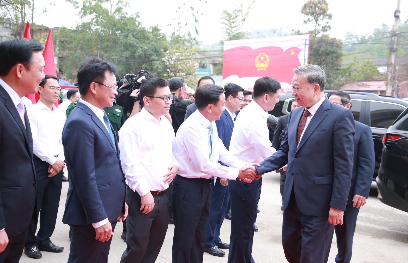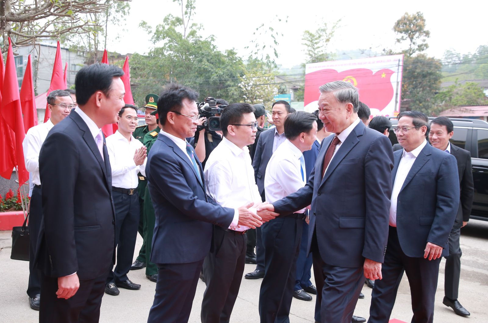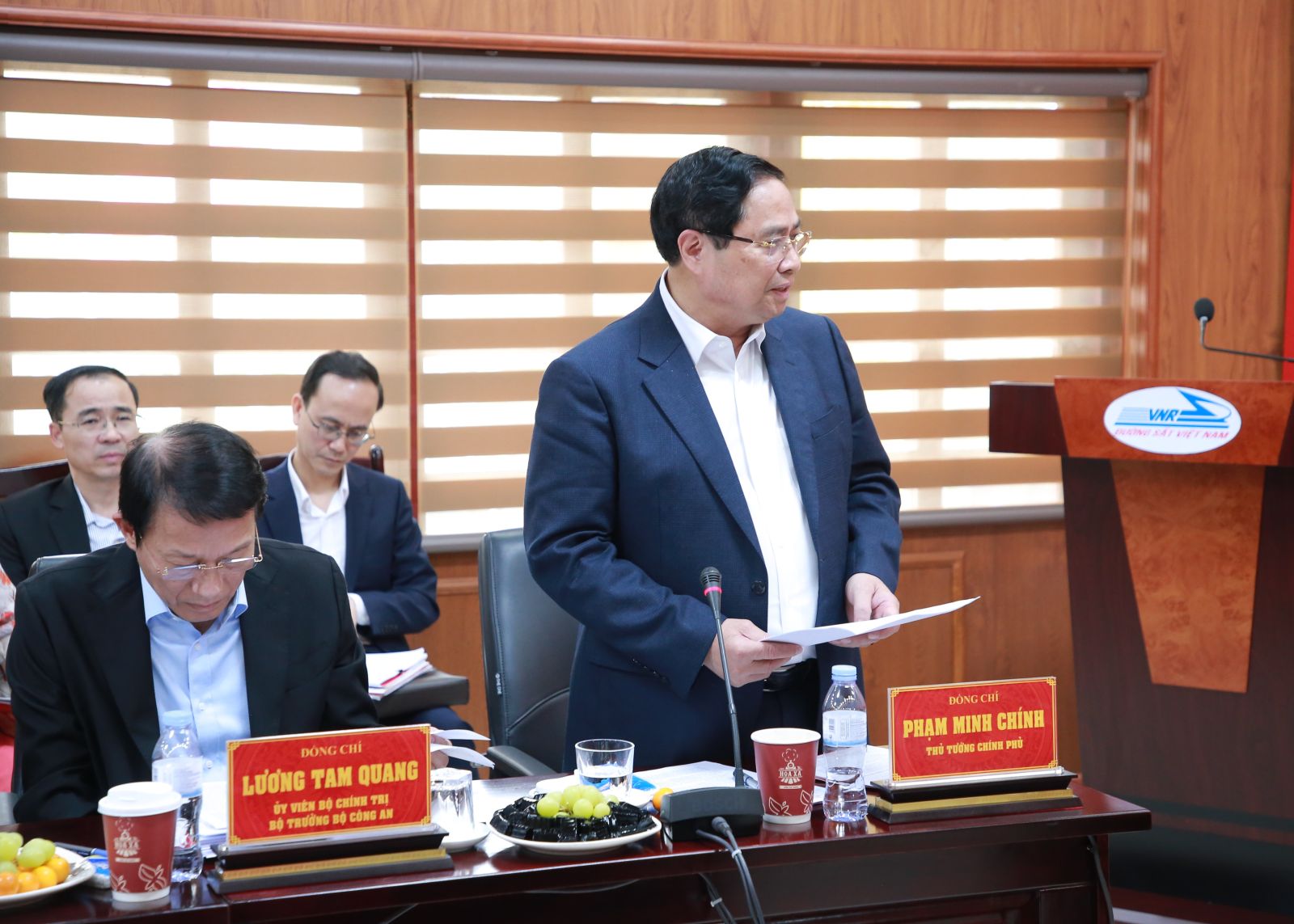 Tổng Bí thư Tô Lâm, Thủ tướng Chính phủ Phạm Minh Chính, Bộ trưởng Bộ Công an Lương Tam Quang và các đồng chí Lãnh đạo Đường sắt Việt Nam, ga Đồng Đăng.