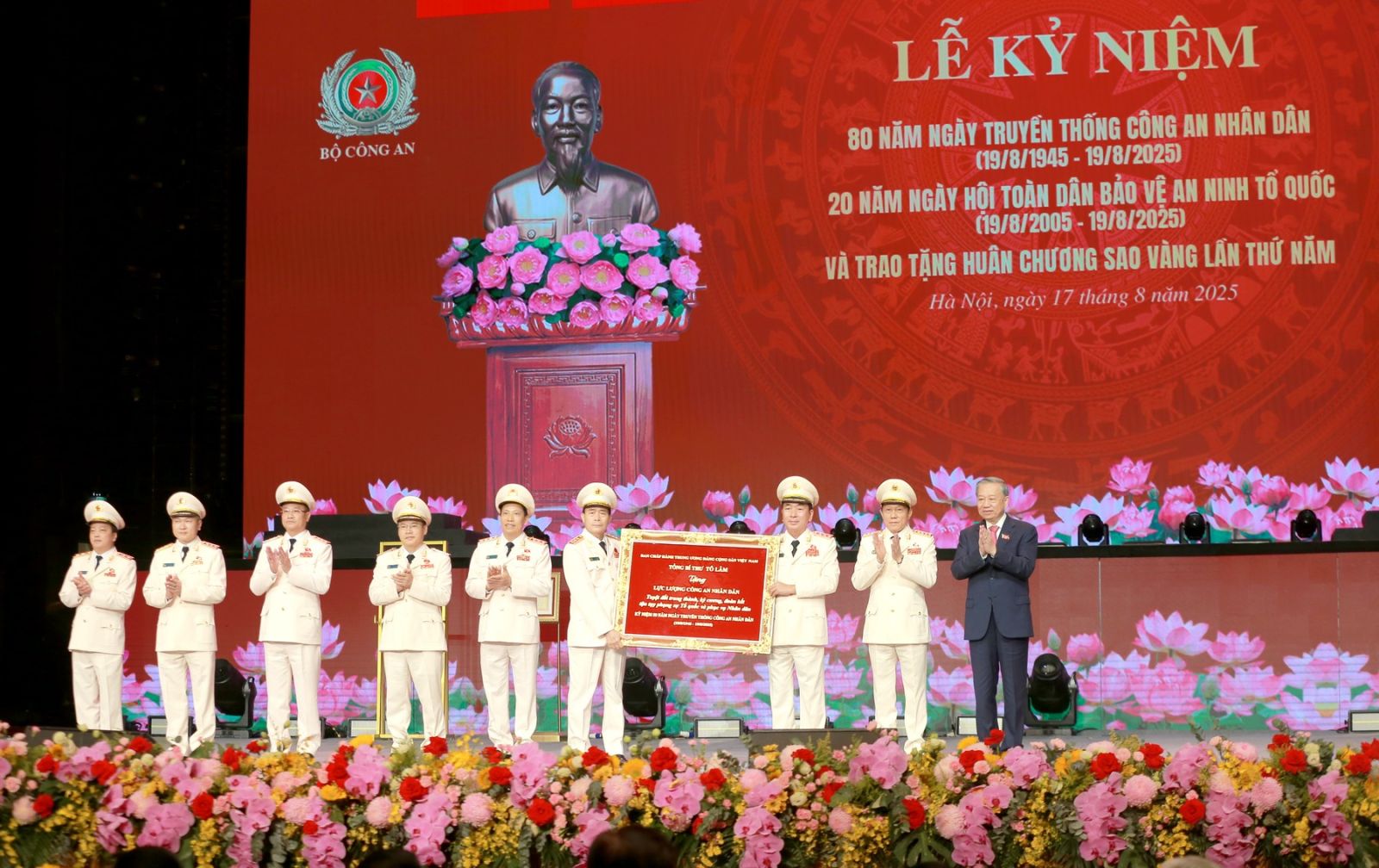 (ĐCSVN) - Sáng 17/8, tại Hà Nội, Tổng Bí thư Tô Lâm và các đồng chí lãnh đạo, nguyên lãnh đạo Đảng, Nhà nước dự Lễ kỷ niệm 80 năm Ngày truyền thống Công an nhân dân Việt Nam (19/8/1945-19/8/2025), 20 năm Ngày hội toàn dân bảo vệ an ninh Tổ quốc (19/8/2005-19/8/2025) và trao tặng Huân chương Sao Vàng lần thứ năm.