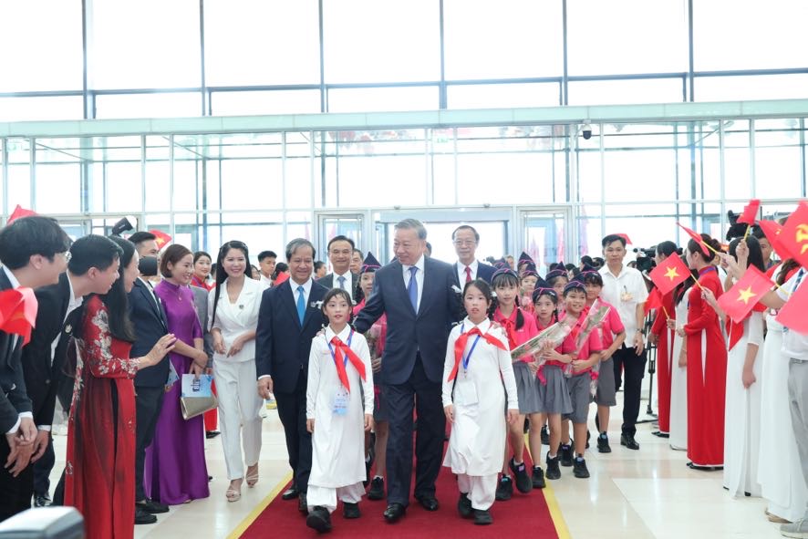 Chủ tịch nước Lương Cường cùng các đại biểu tới dự khai giảng năm học 2025 – 2026 và kỷ niệm 80 năm truyền thống ngành Giáo dục. Ảnh: Báo GDTĐ