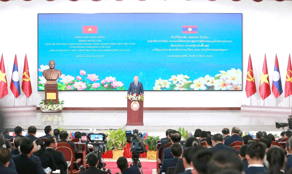 (ĐCSVN) – Chiều 1/12, trong chuyến thăm, gặp gỡ tại Học viện Chính trị - Hành chính quốc gia Lào (Viêng Chăn), Tổng Bí thư Tô Lâm đã có bài Phát biểu chính sách. Cổng thông tin điện tử Đảng Cộng sản Việt Nam trân trọng giới thiệu toàn văn bài phát biểu dưới nhan đề "Kế thừa tình hữu nghị vĩ đại, vun đắp quan hệ đoàn kết đặc biệt, củng cố hợp tác toàn diện và đẩy mạnh gắn kết chiến lược Việt Nam - Lào trong giai đoạn mới".