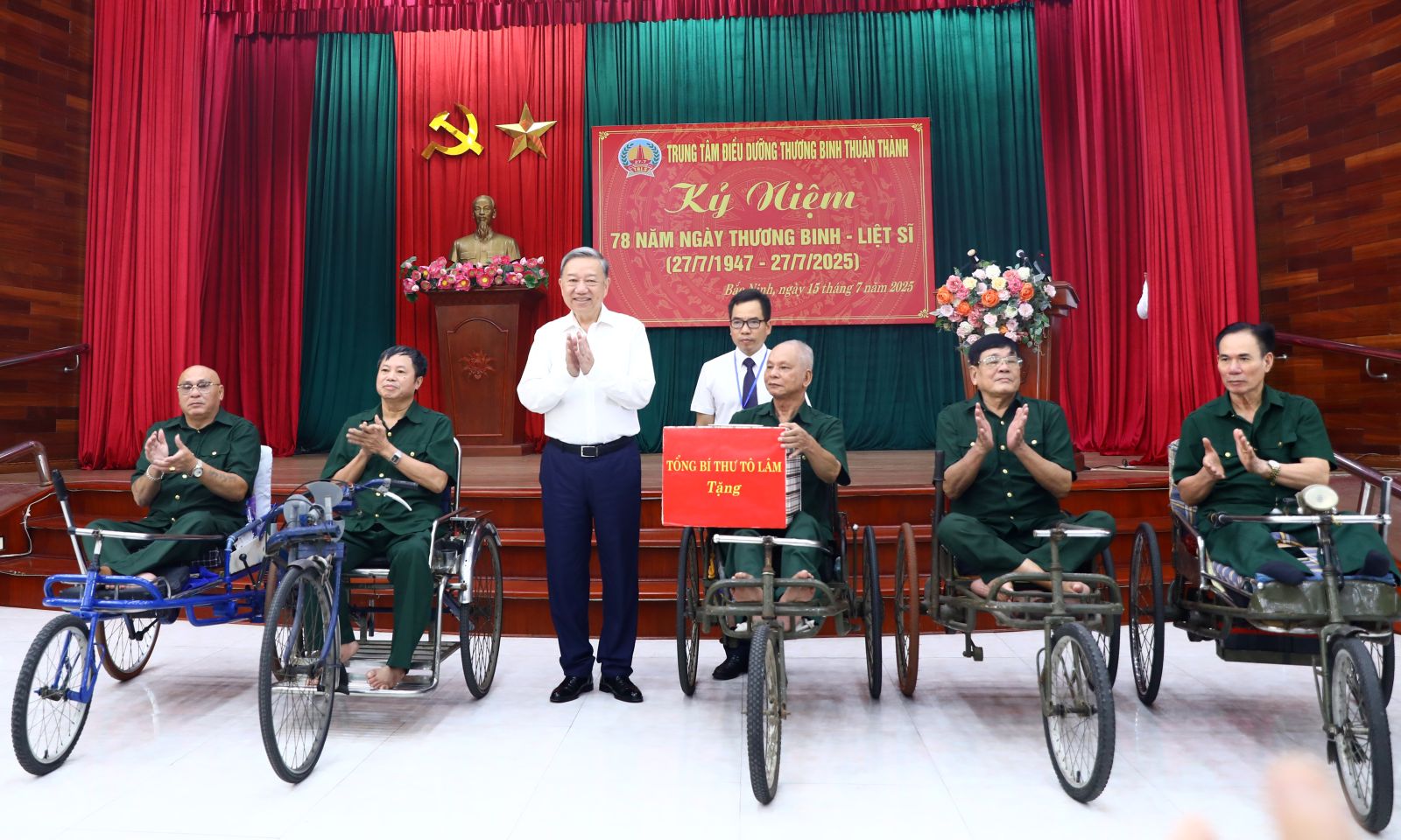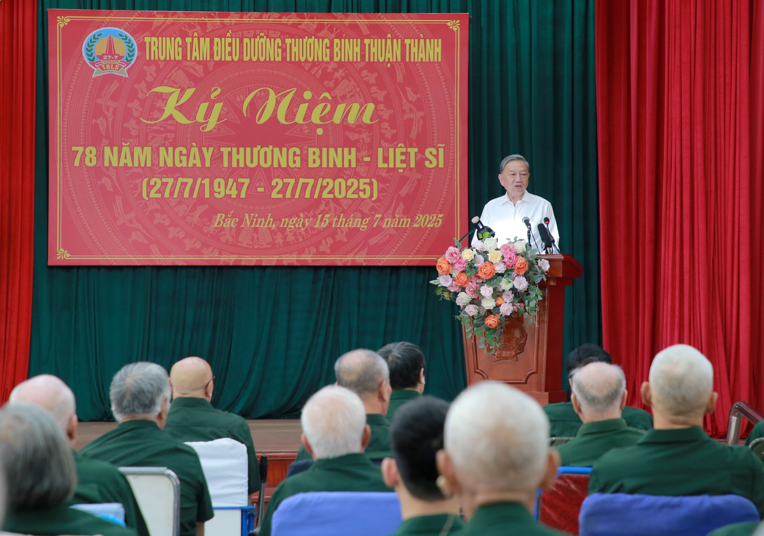 Nhân kỷ niệm 78 năm Ngày Thương binh - Liệt sĩ (27-7-1947 / 27-7-2025), chiều 15/7, Tổng Bí thư Tô Lâm cùng Đoàn công tác Trung ương đã tới thăm, tặng quà thương, bệnh binh tại Trung tâm Điều dưỡng thương binh Thuận Thành, tỉnh Bắc Ninh.
