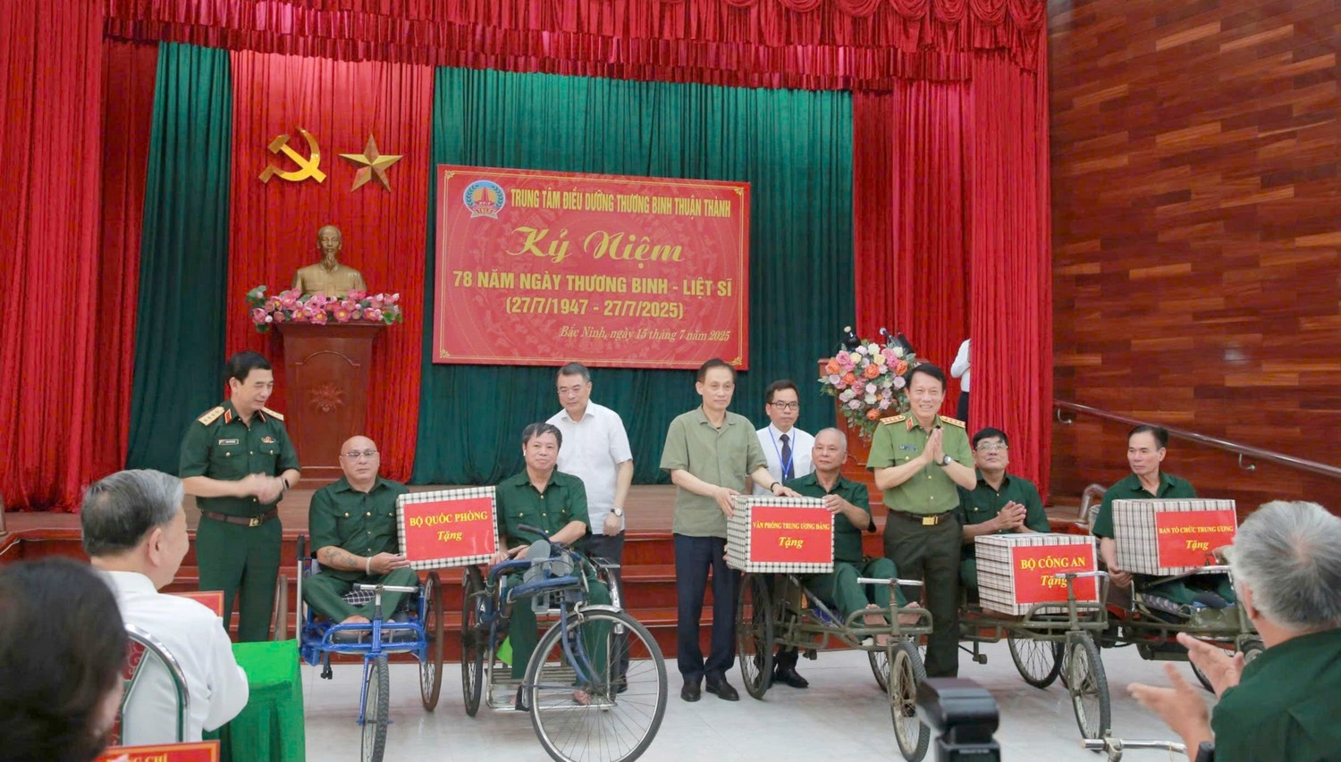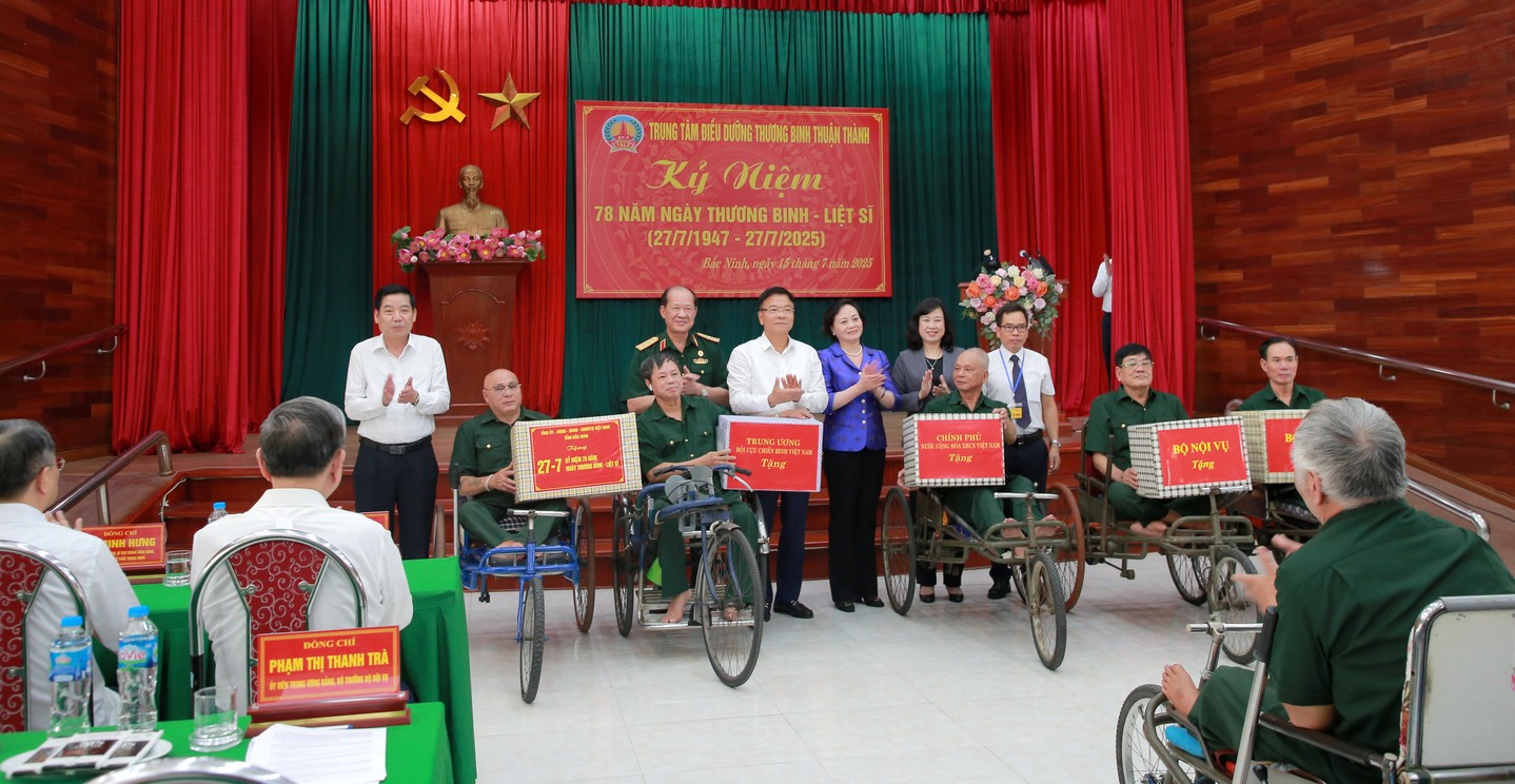 Nhân dịp này, Tổng Bí thư Tô Lâm và các đại diện lãnh đạo các ban, bộ, ngành Trung ương, tỉnh Bắc Ninh đã tặng quà các thương binh, bệnh binh đang điều dưỡng tại Trung tâm; đại diện 5 gia đình liệt sĩ được Thủ tướng Chính phủ cấp Bằng “Tổ quốc ghi công” dịp tháng 6-2025 (là 5 trường hợp thương, bệnh binh đang điều trị tại Trung tâm hy sinh do vết thương đặc biệt tái phát); tập thể cán bộ, nhân viên Trung tâm Điều dưỡng thương binh Thuận Thành.