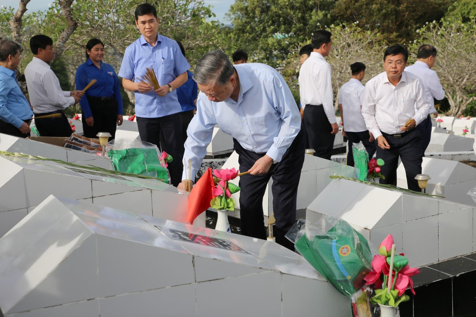 Tổng Bí thư Tô Lâm và Đoàn công tác thắp hương các mộ phần liệt sỹ tại Nghĩa trang liệt sỹ Phú Quốc.