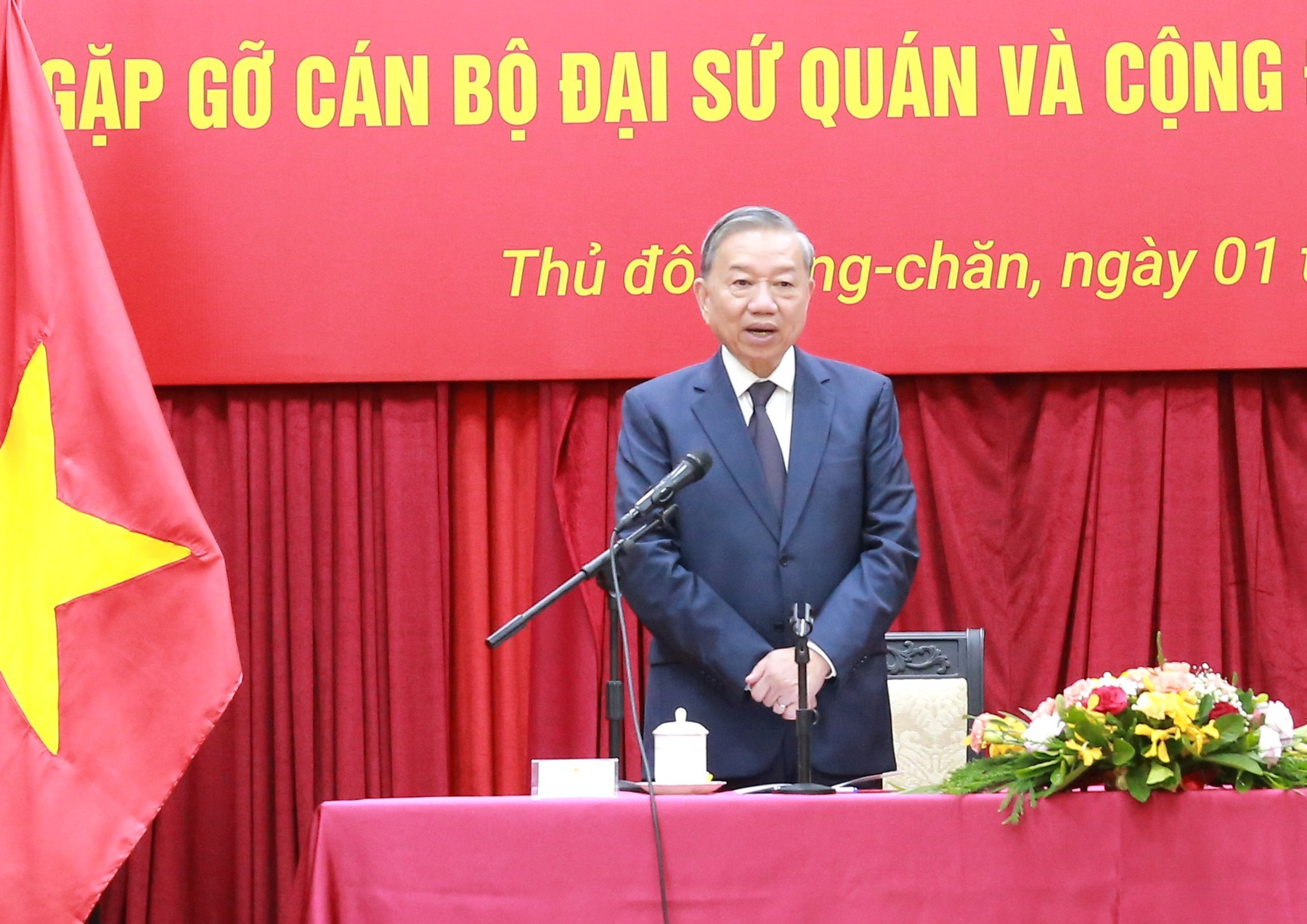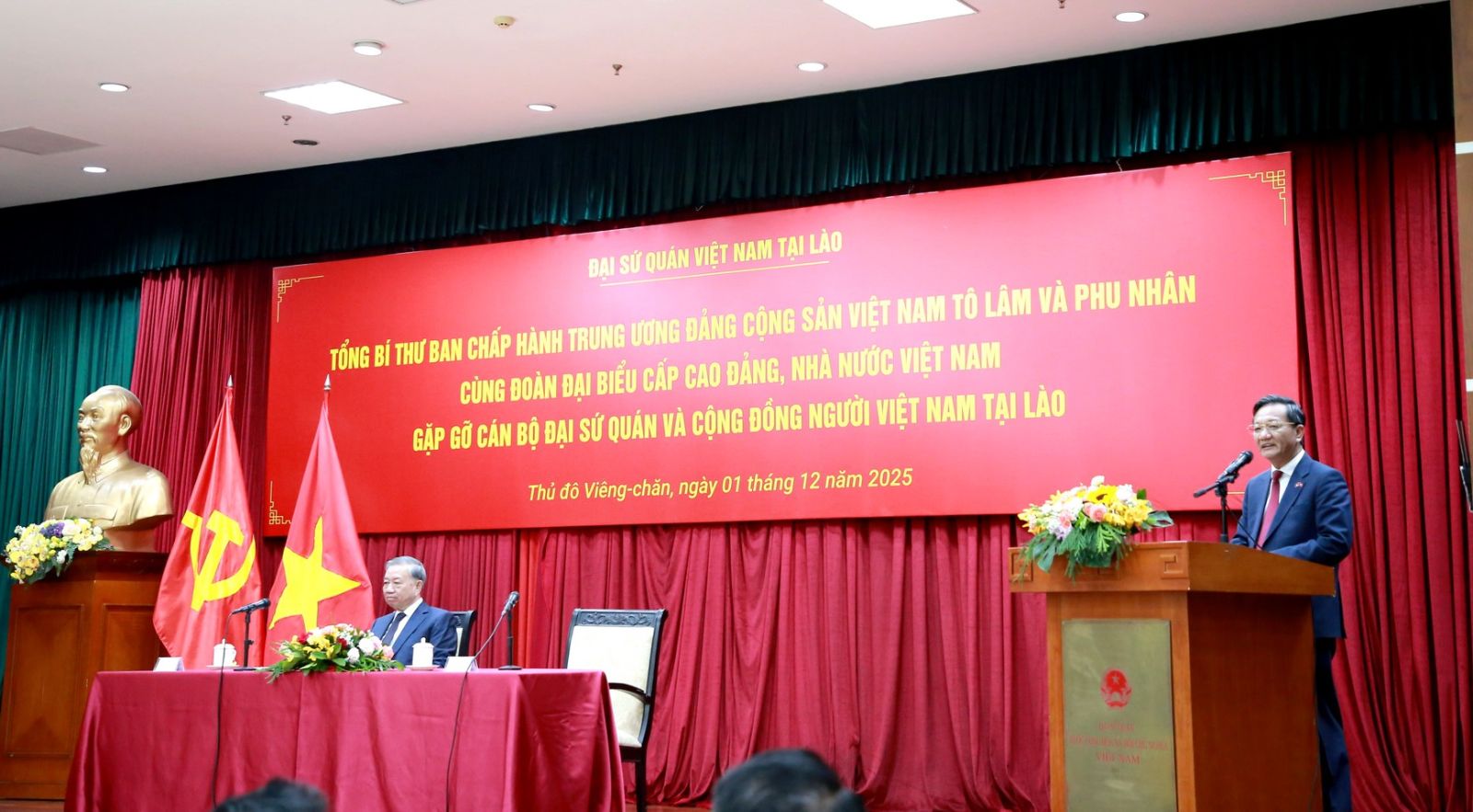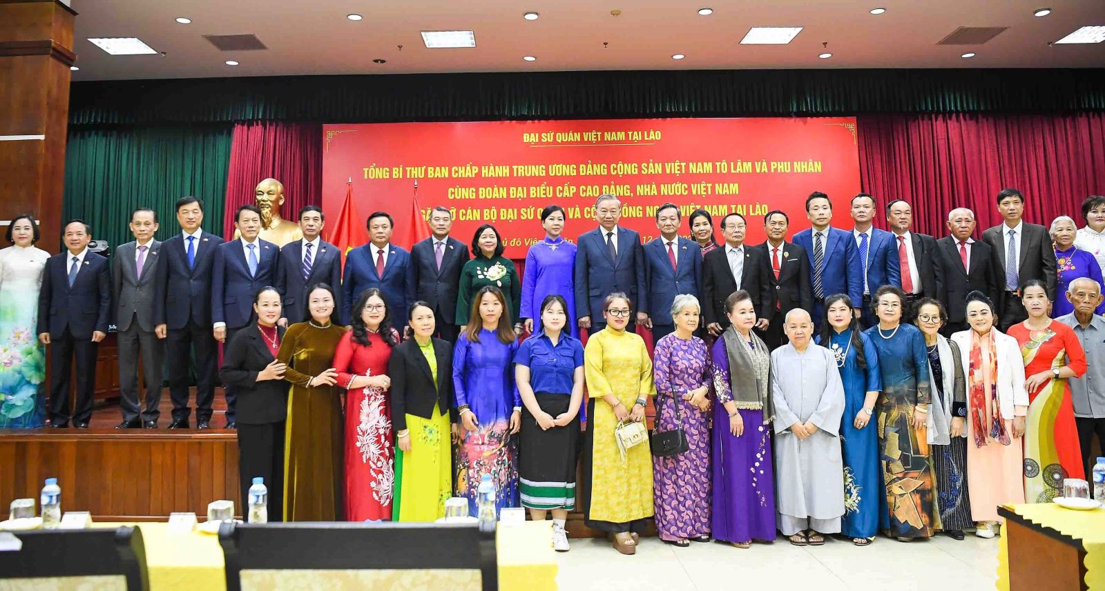 Trong khuôn khổ chuyến thăm cấp Nhà nước Cộng hòa Dân chủ Nhân dân Lào, dự Lễ kỷ niệm 50 năm Quốc khánh nước Cộng hòa Dân chủ Nhân dân Lào và đồng chủ trì Cuộc gặp cấp cao giữa Đảng Cộng sản Việt Nam và Đảng Nhân dân Cách mạng Lào, chiều tối 1/12, tại Thủ đô Viêng Chăn, Tổng Bí thư Tô Lâm và Phu nhân cùng Đoàn đại biểu cấp cao Việt Nam có gặp gỡ cán bộ Đại sứ quán Việt Nam và cộng đồng người Việt Nam tại Lào.
