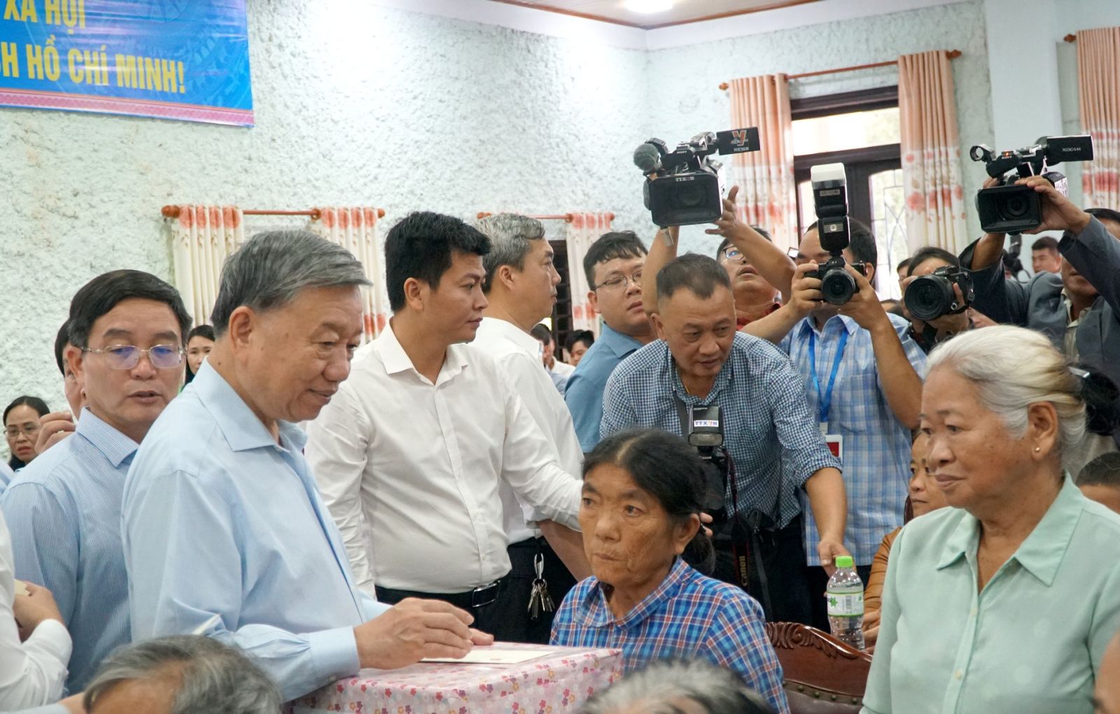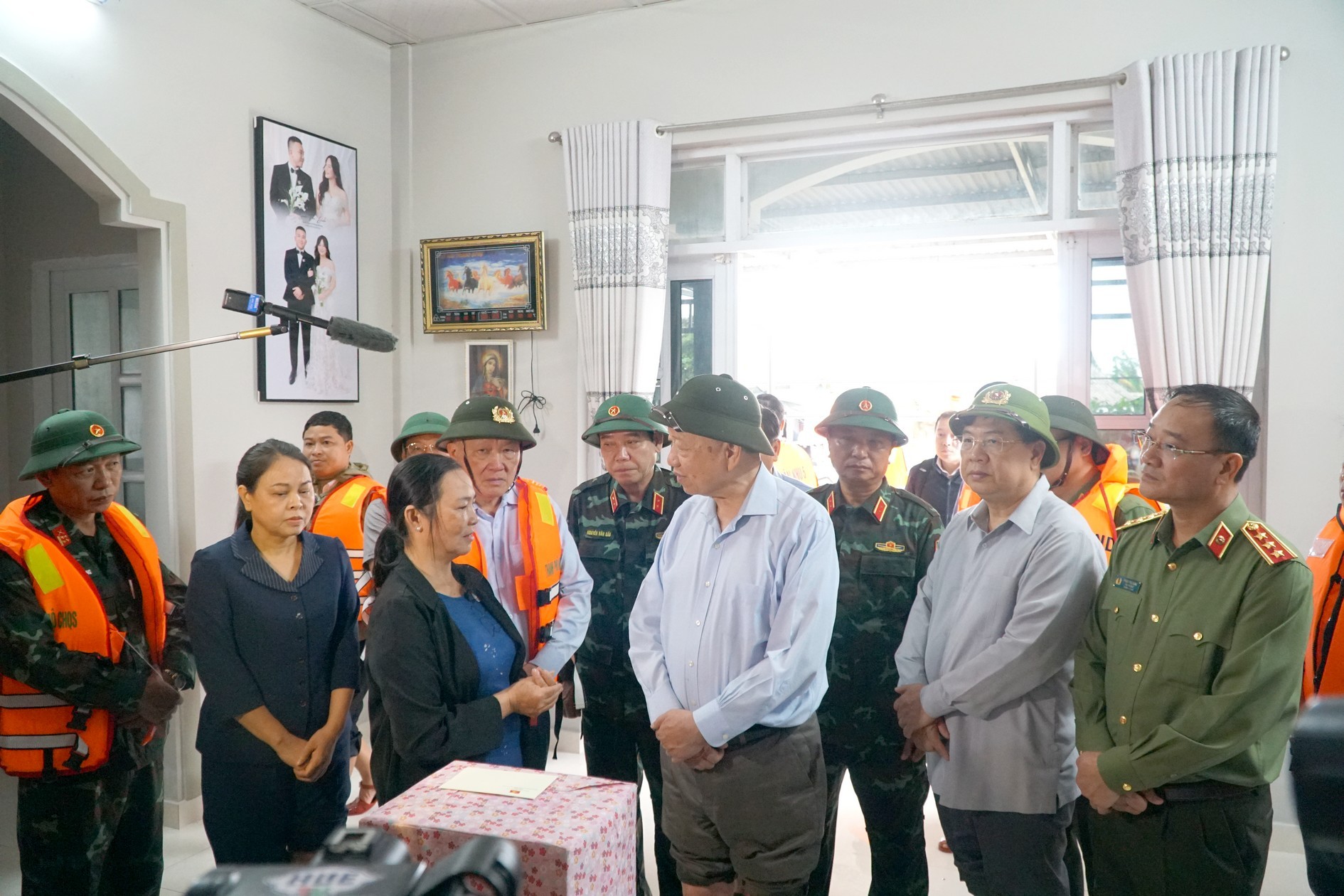 Tổng Bí thư Tô Lâm thăm hỏi và tặng quà cho người dân vùng bị chia cắt do mưa lũ tại thôn Khuông Phò Đông, xã Quảng Điền, Thành phố Huế.